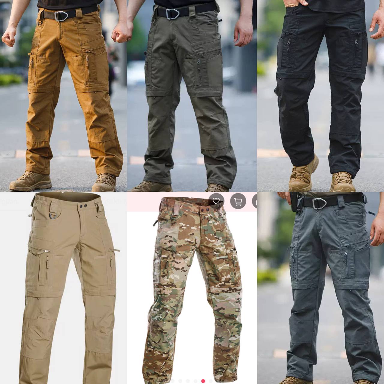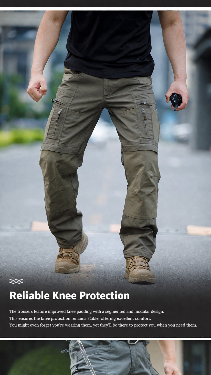 These pants have a strong outdoor look and the details are very useful. The zip pockets, reinforced knee area, and belt loop design make them feel much more functional than regular cargo pants.