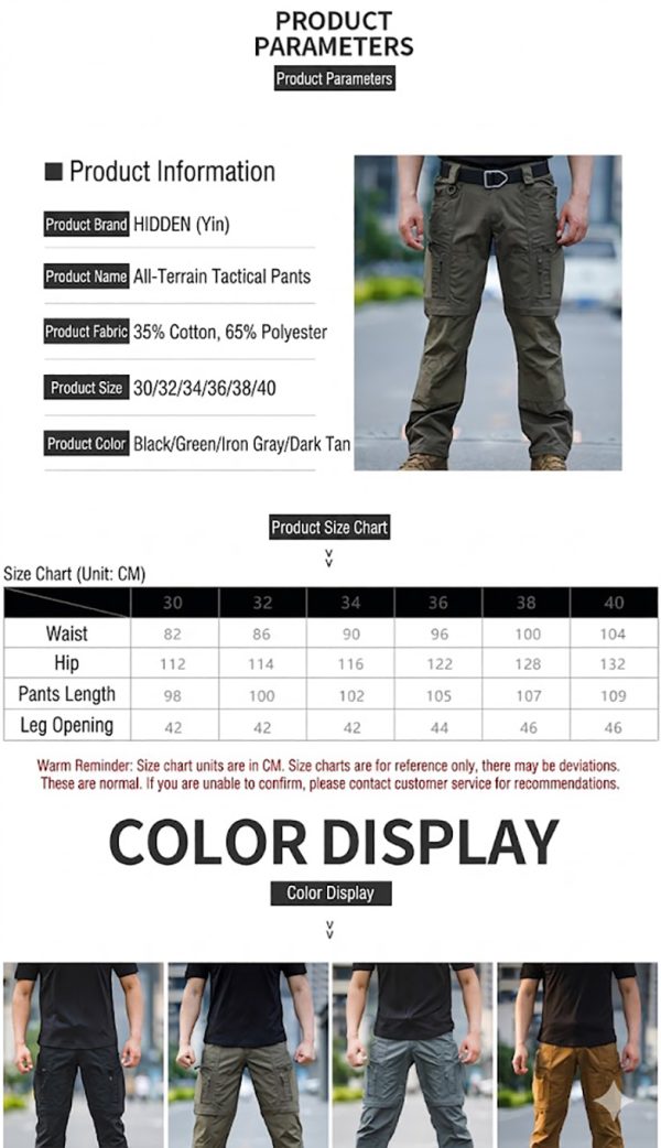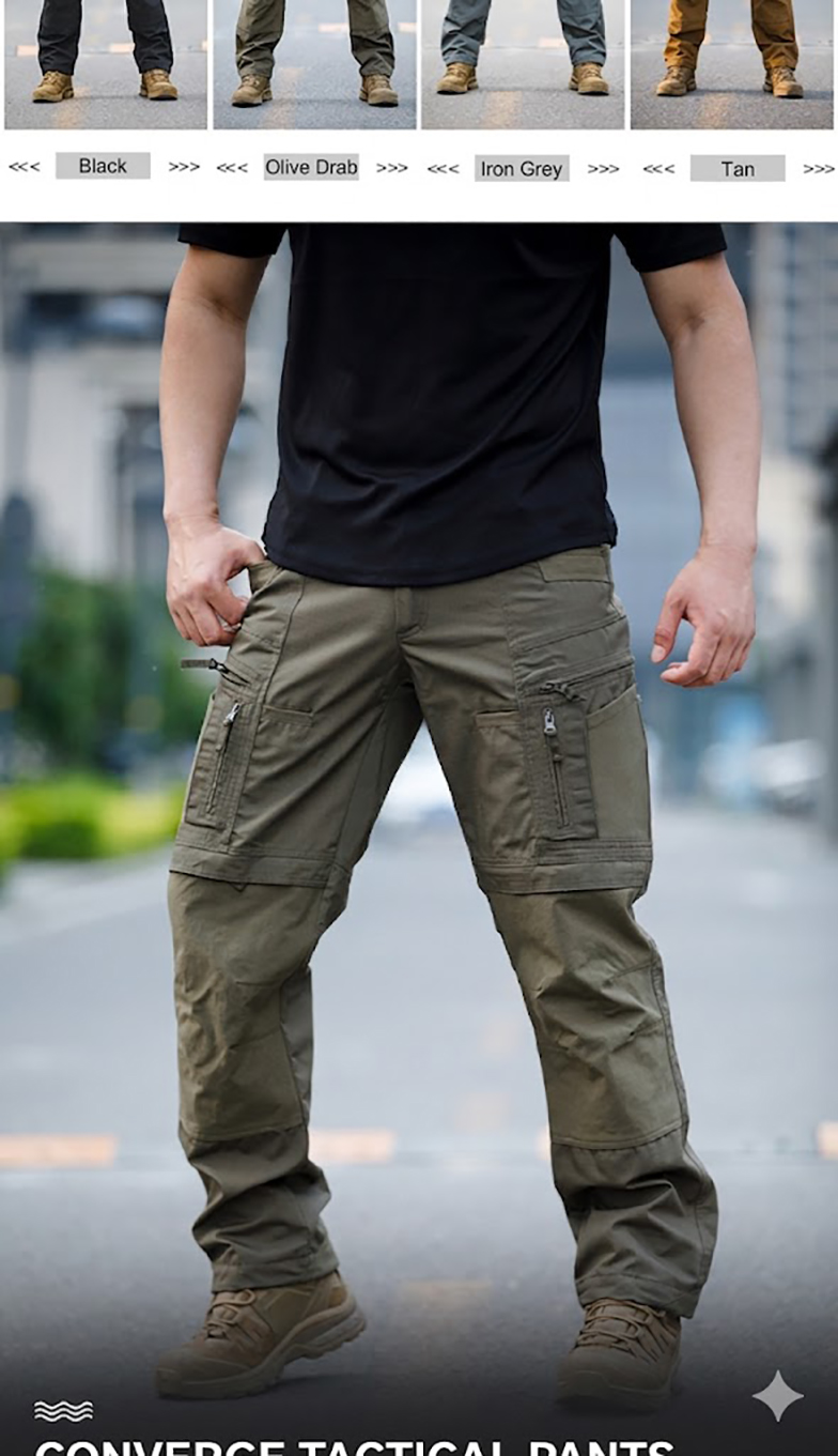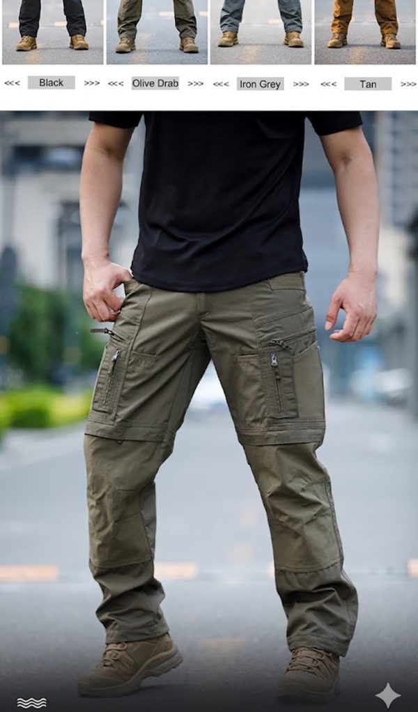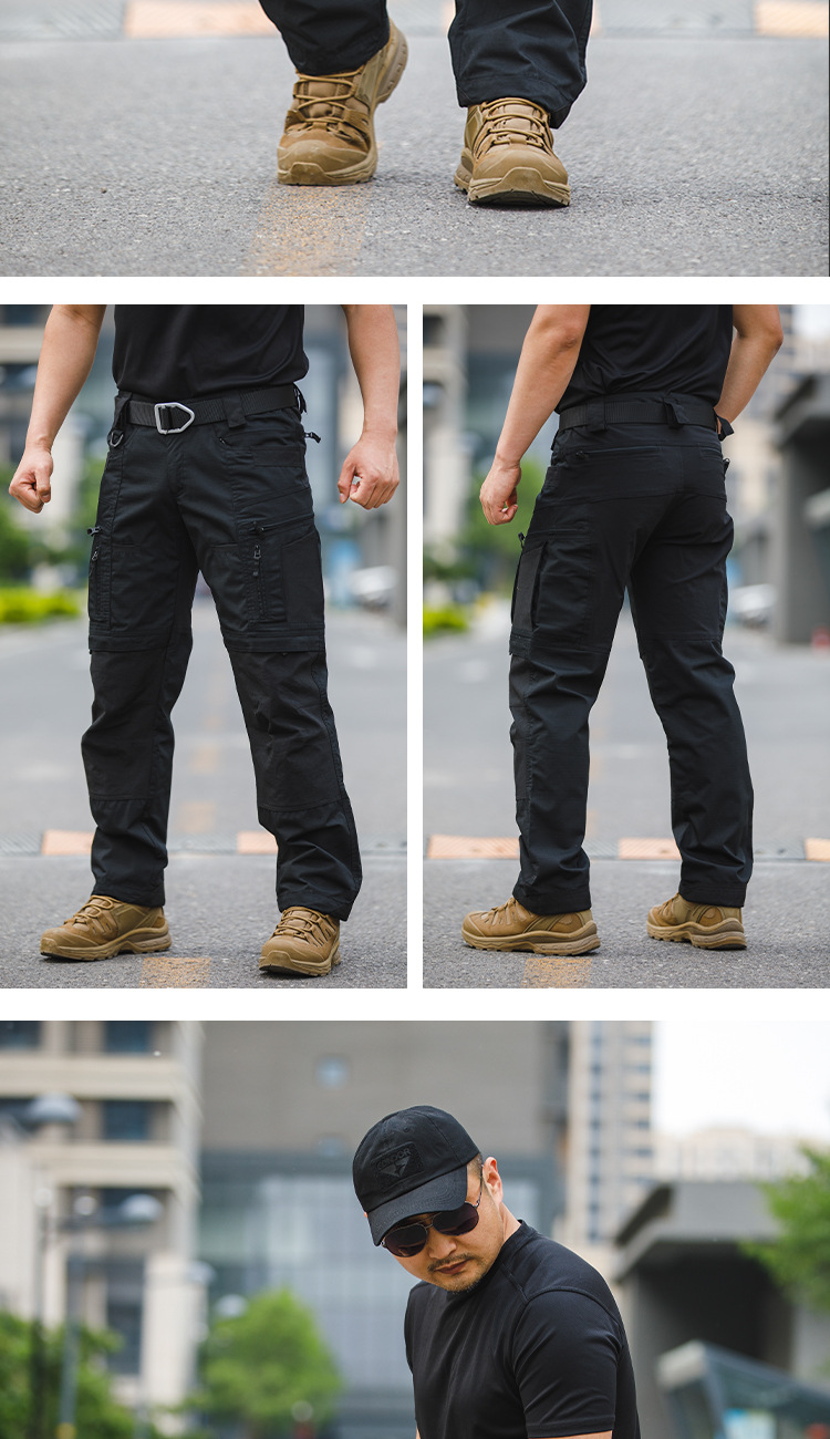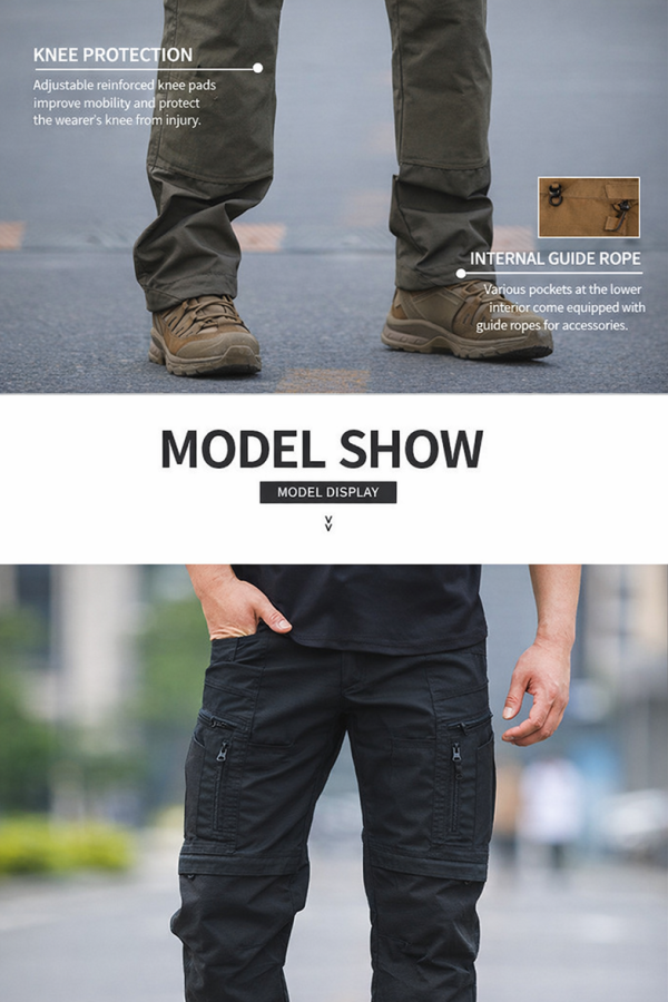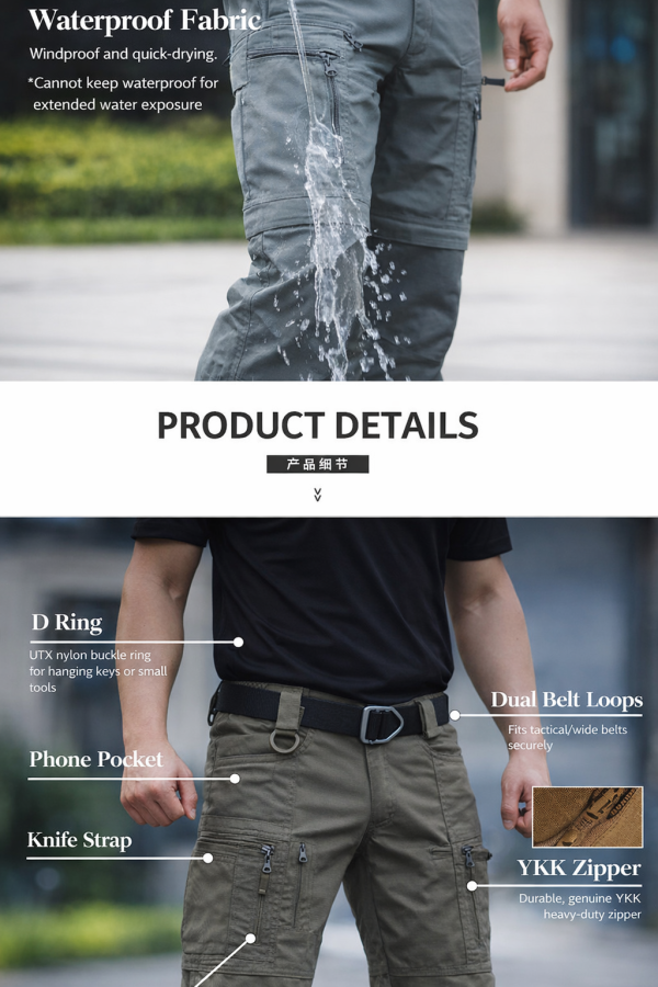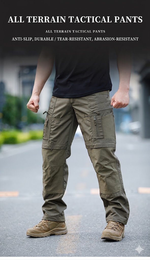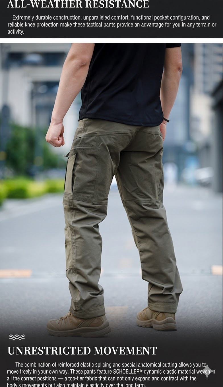 - Tactical cargo pants silhouette with a clean all-terrain outdoor look