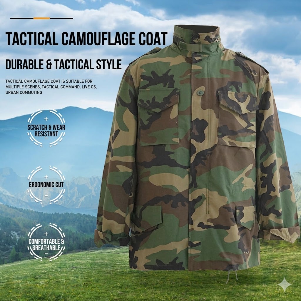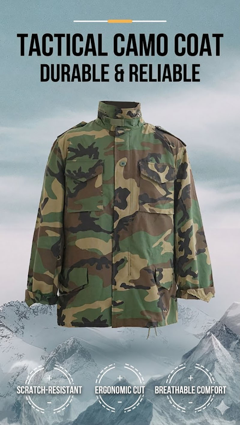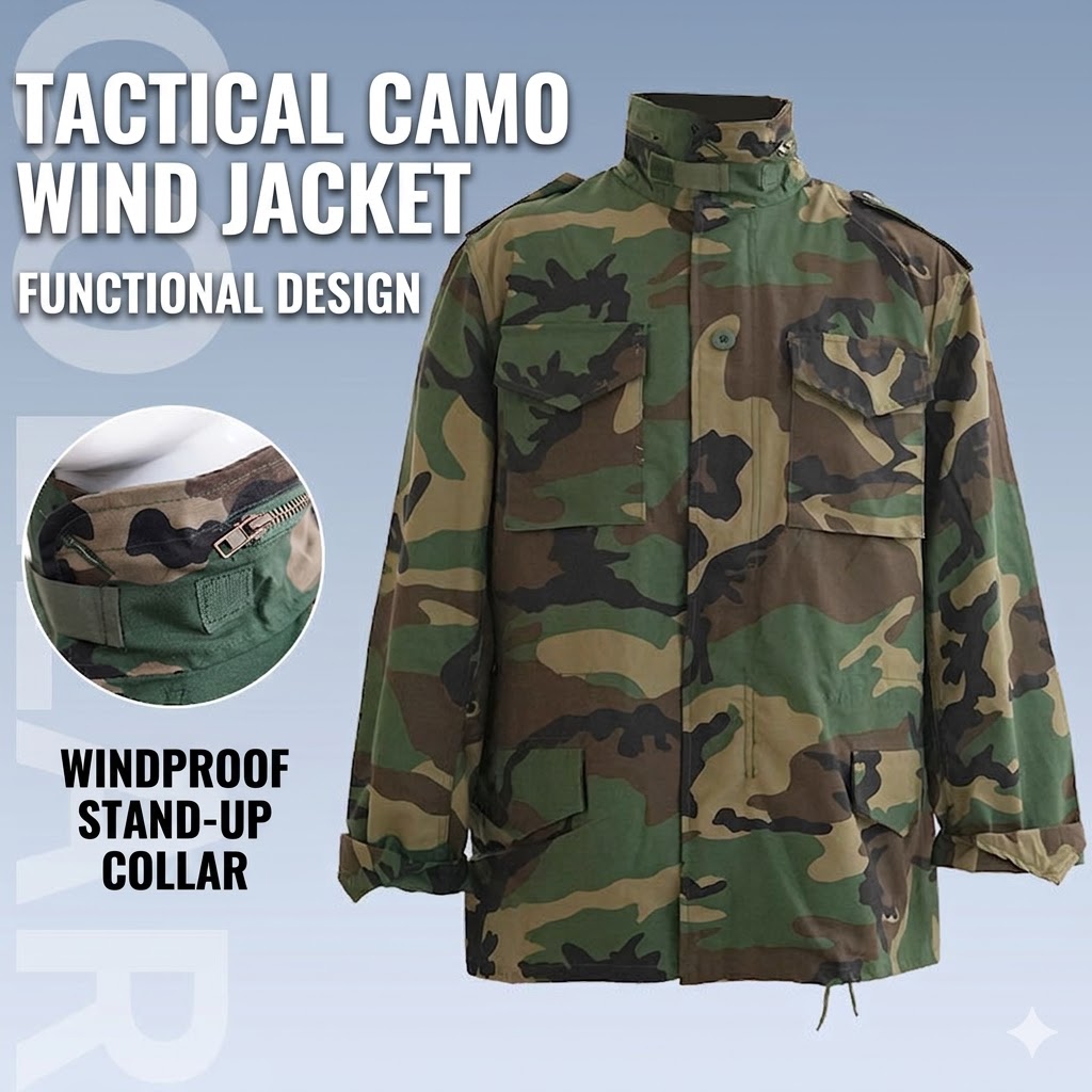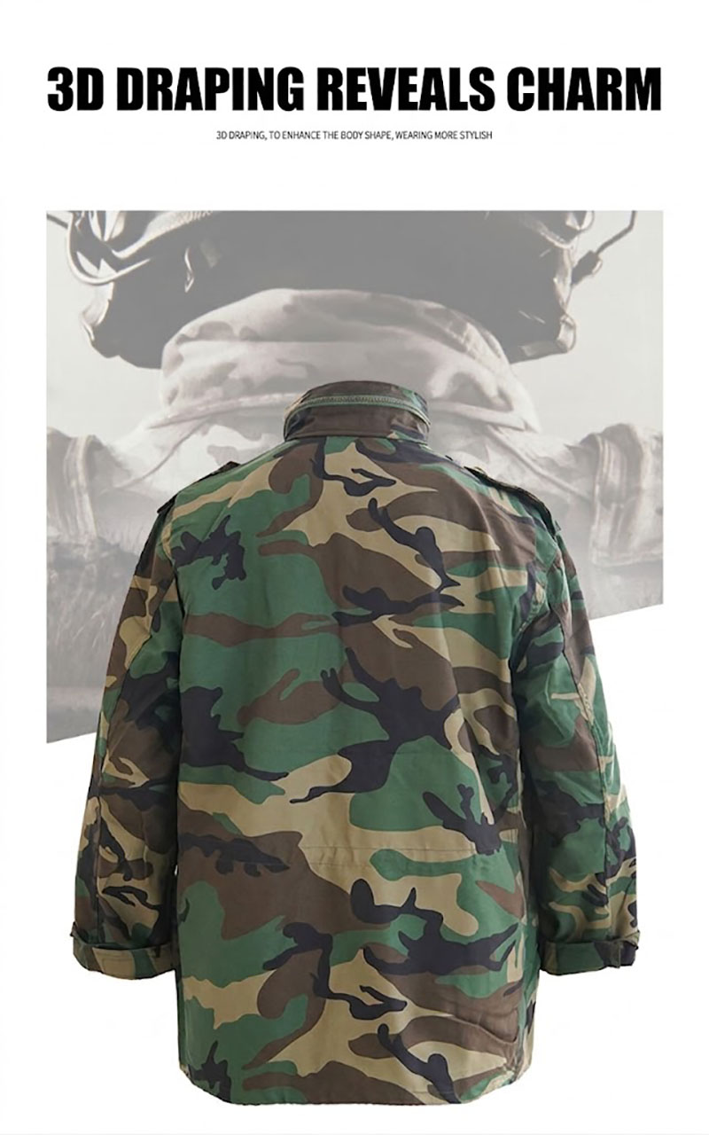 Classic M65-Inspired Tactical Style This jacket carries a structured M65-style silhouette with a mid-length cut, a camouflage finish, and a clean field-jacket profile that feels both practical and visually strong. It has the kind of outdoor look that pairs easily with cargo pants, jeans, boots, or everyday casual wear, making it suitable for customers who like military-inspired clothing without giving up everyday versatility.