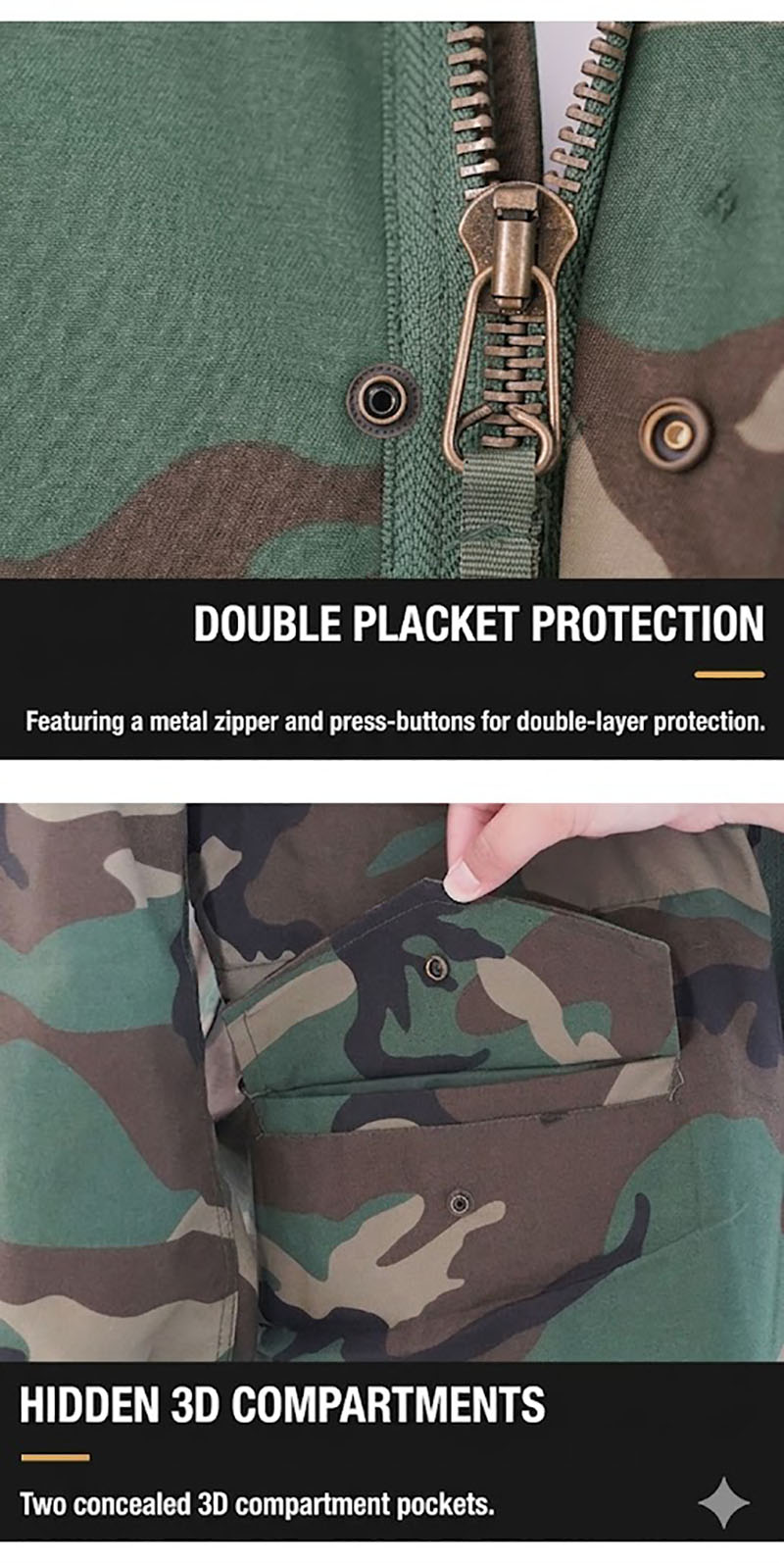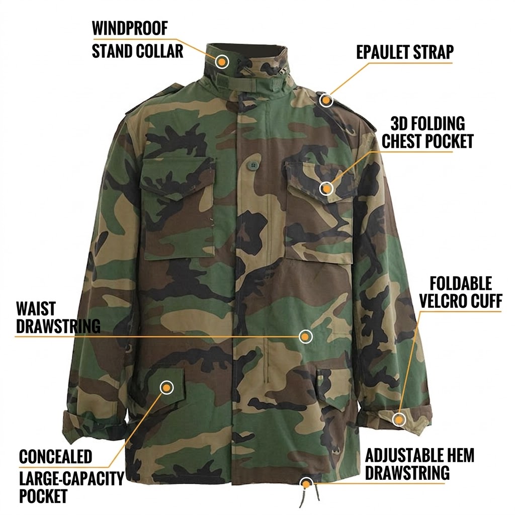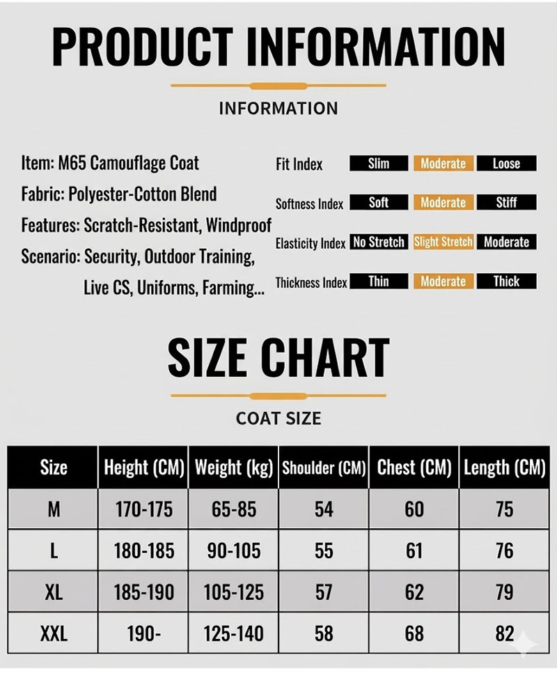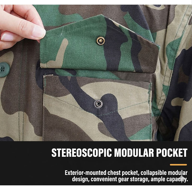 Classic M65-Inspired Tactical Style This jacket carries a structured M65-style silhouette with a mid-length cut, a camouflage finish, and a clean field-jacket profile that feels both practical and visually strong. It has the kind of outdoor look that pairs easily with cargo pants, jeans, boots, or everyday casual wear, making it suitable for customers who like military-inspired clothing without giving up everyday versatility.