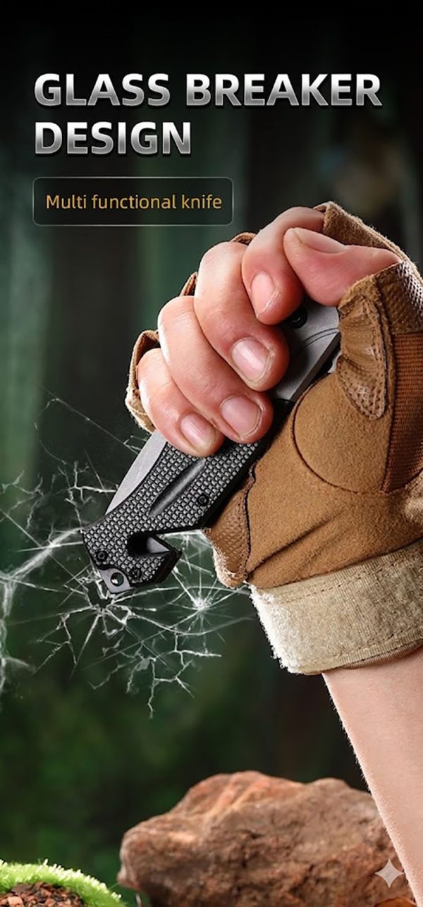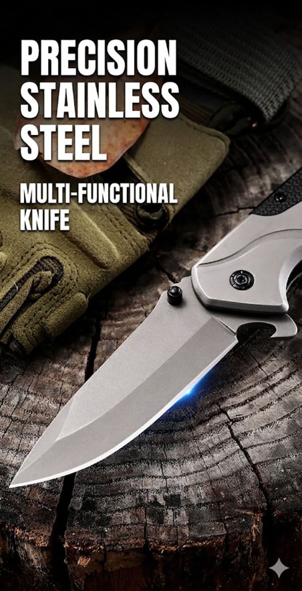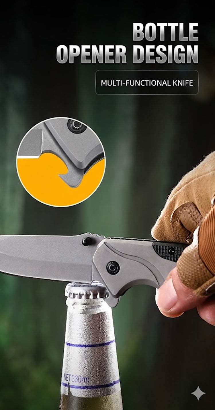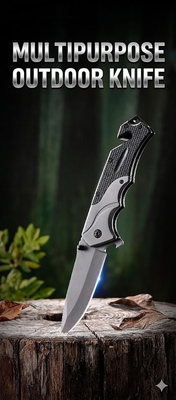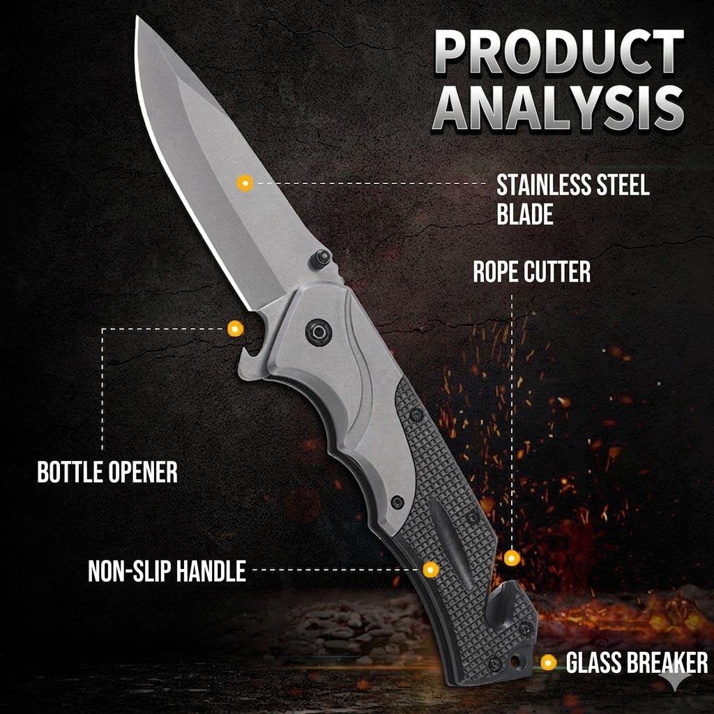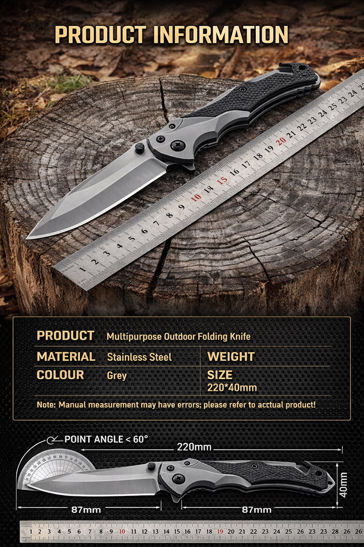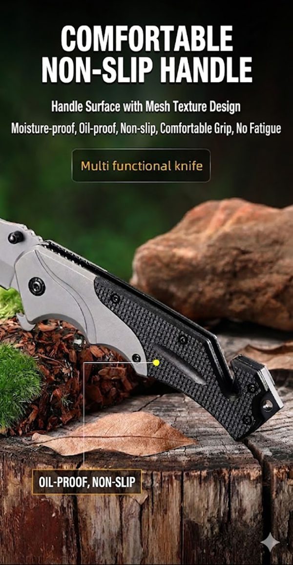 Be prepared for any situation with this highly versatile multipurpose folding knife. Engineered from precision stainless steel, it features an integrated glass breaker, rope cutter, and bottle opener, making it the ultimate tool for everyday carry (EDC) and outdoor survival. Equipped with an oil-proof and moisture-proof non-slip handle, this knife guarantees a secure grip and smooth deployment whenever you need it most.
