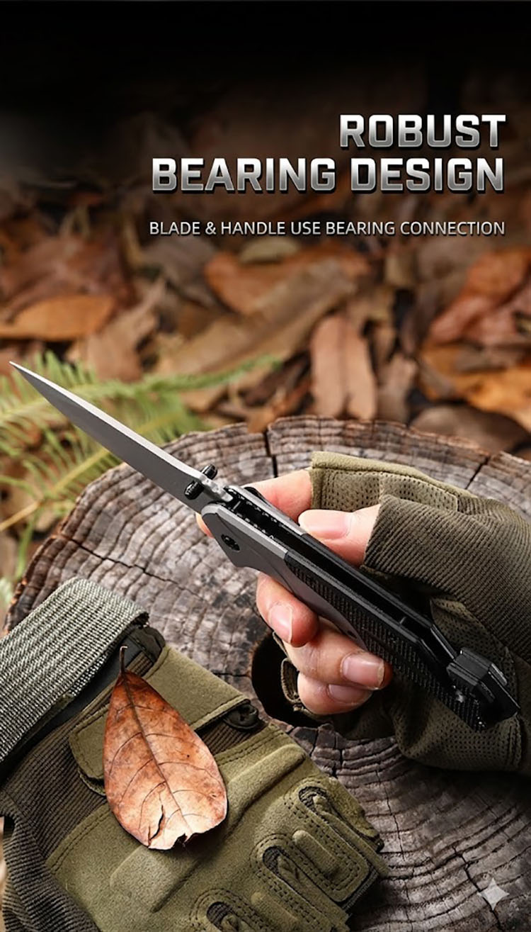 Precision Engineering and Durability Whether you are carving branches at a campsite or handling heavy-duty cutting tasks, a reliable blade is your best asset. This tactical folding knife is forged from high-quality stainless steel, featuring a sharply angled point (under 60 degrees) for precise piercing and smooth slicing. The robust bearing design connecting the blade and handle ensures a highly fluid and satisfying folding action every single time.