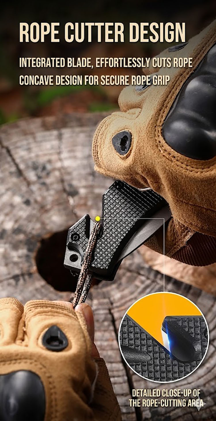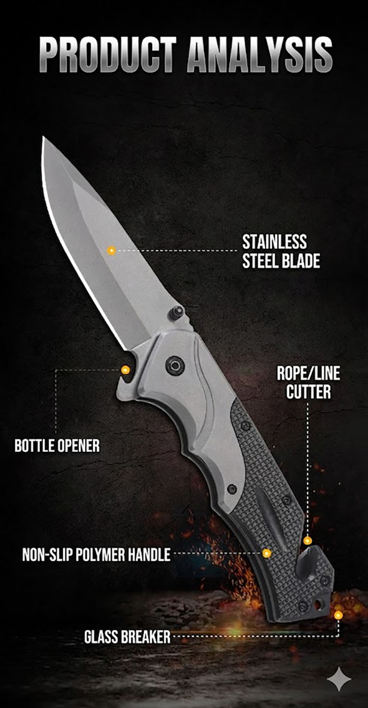 - 5-in-1 Functionality: Includes the main blade, a secure rope/line cutter, a glass breaker, a bottle opener, and a pocket clip.