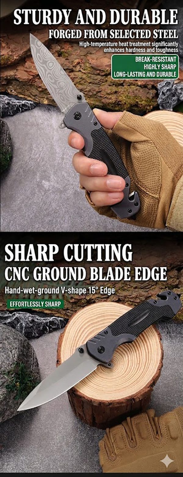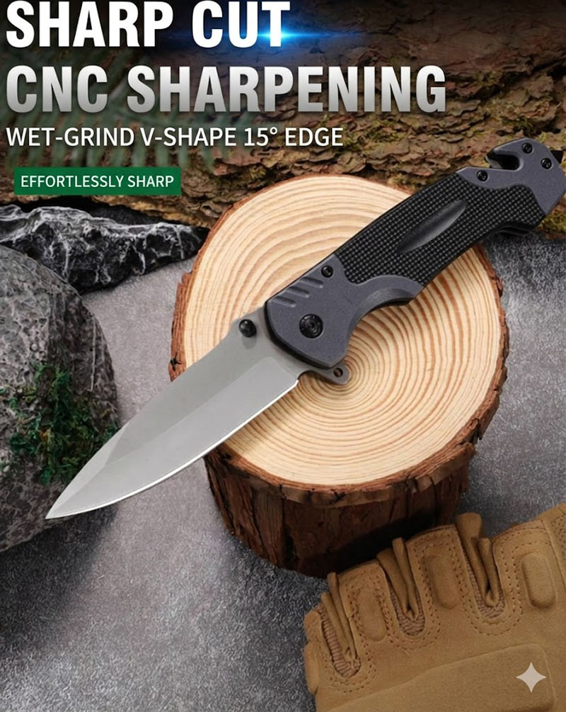 Gear up with this sleek, smooth-blade tactical folding knife. Crafted from high-hardness forged steel with a precision CNC-ground 15-degree edge, it offers clean, effortless cutting for any outdoor adventure or daily task. Equipped with a built-in rope cutter, an emergency glass breaker, and a heavy-duty pocket clip, it is a highly reliable and minimalist everyday carry (EDC) tool.