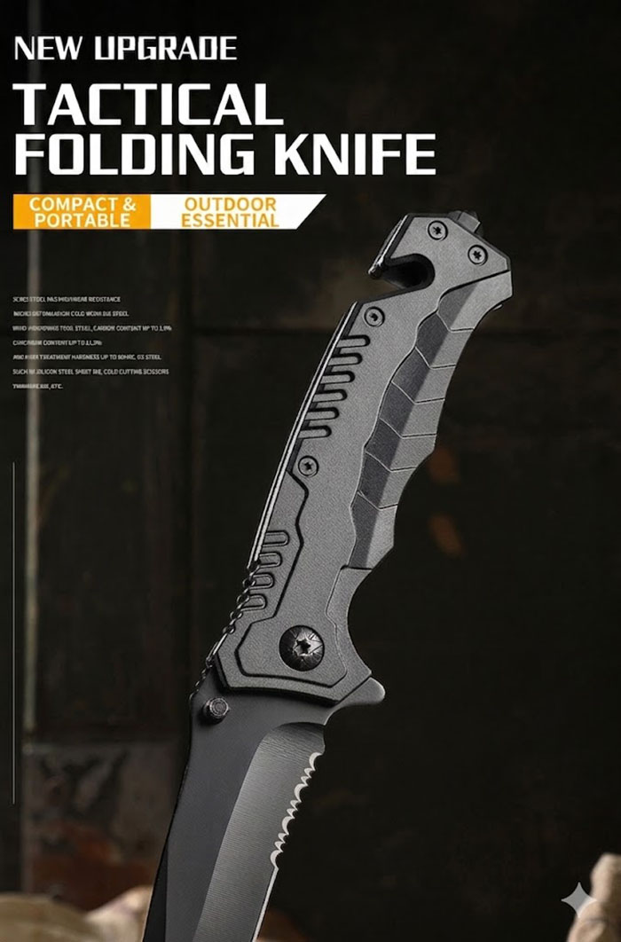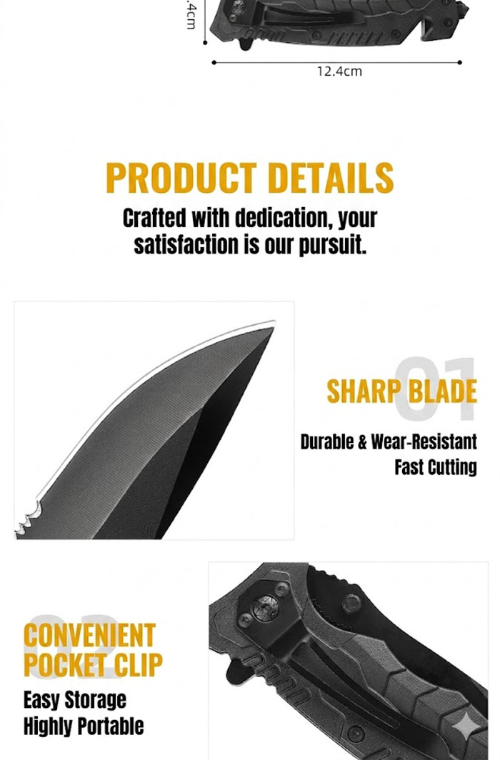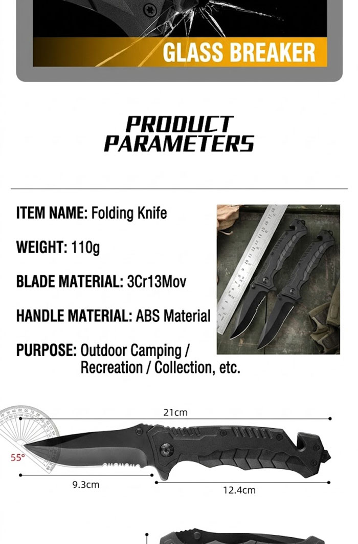 Stay prepared for any outdoor adventure or daily utility task with this highly capable tactical folding knife. Weighing just 110g, it features a high-hardness 3Cr13Mov steel blade with a partially serrated edge, an anti-slip ABS handle, and built-in survival essentials including a glass breaker and a safety line cutter. Compact, durable, and equipped with a convenient pocket clip, it is the perfect lightweight everyday carry (EDC) companion.