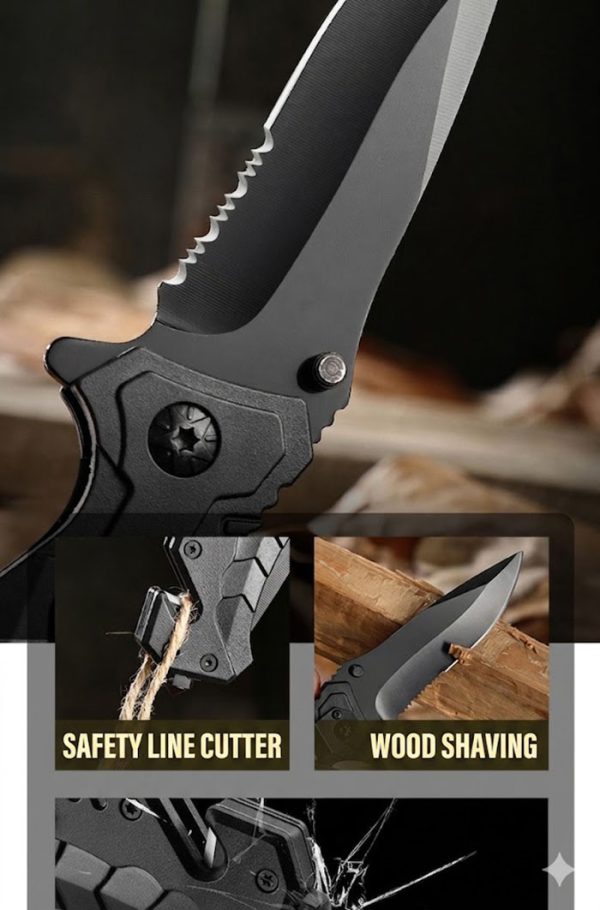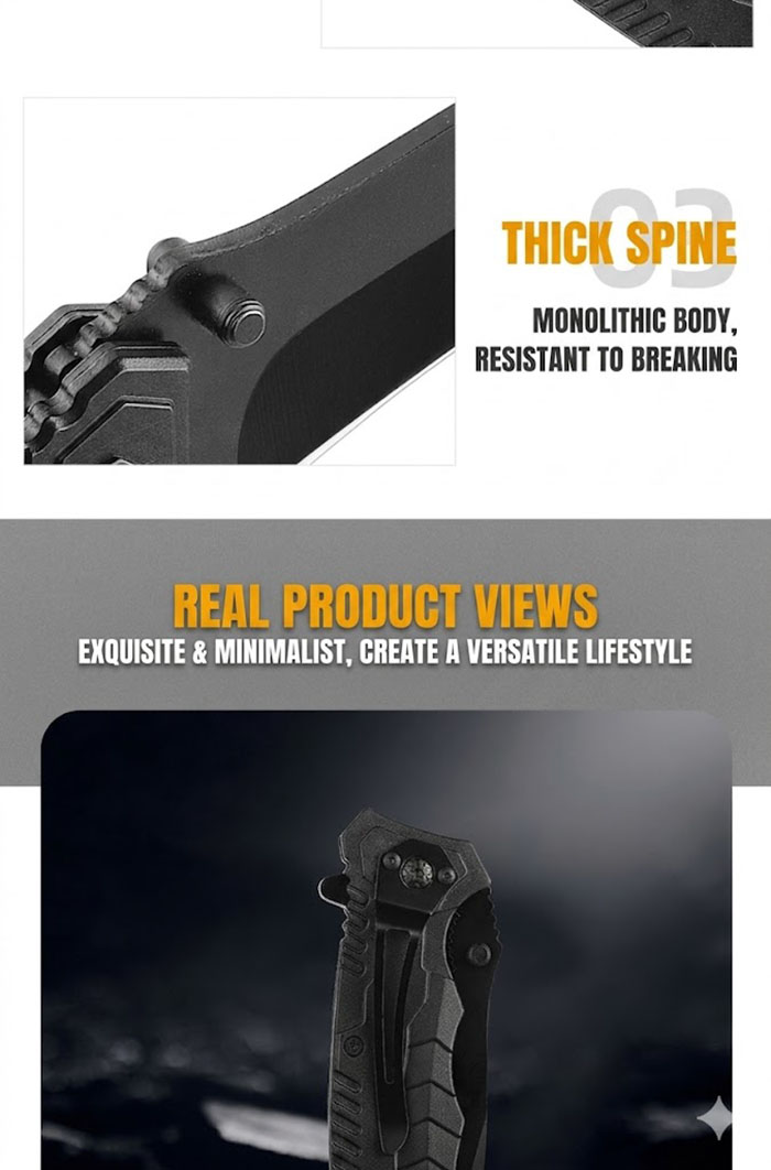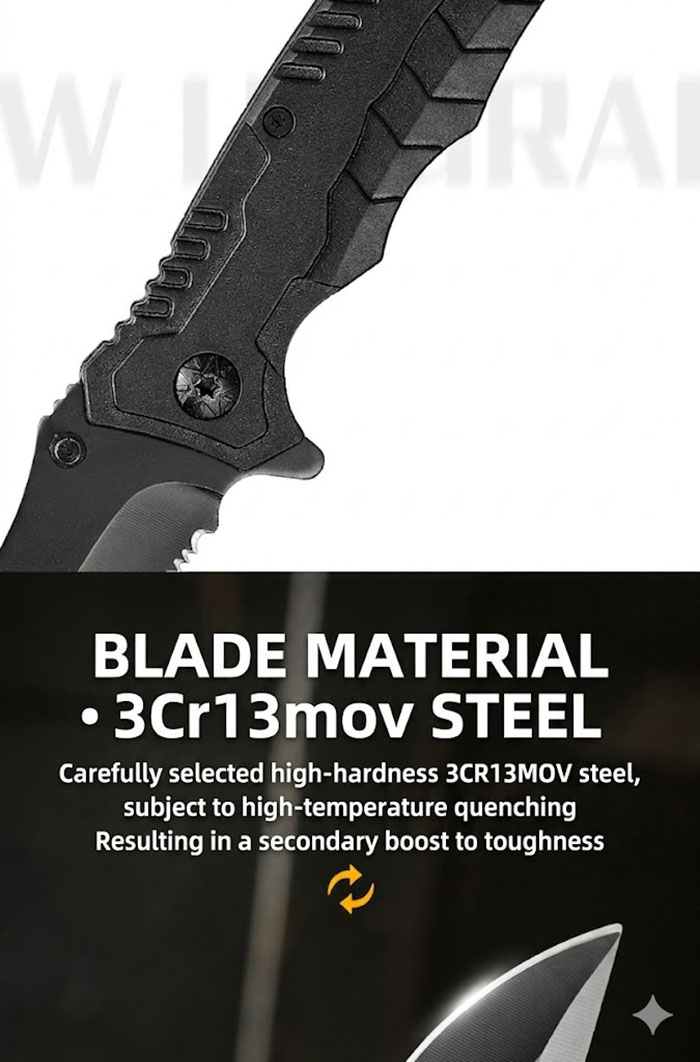 Premium Steel for Ultimate Durability When you are out in the wild, your tools need to perform under pressure. This tactical folding knife is engineered with a carefully selected 3Cr13Mov steel blade, subjected to high-temperature quenching for a secondary boost in toughness. The thick, monolithic spine is highly resistant to breaking, while the sharp 55-degree point and partially serrated edge provide fast, versatile cutting power for wood shaving, slicing, and demanding outdoor tasks.