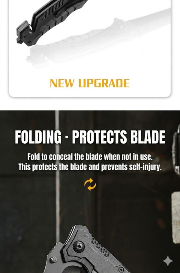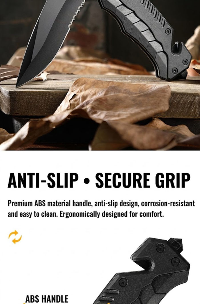 Built-In Emergency Rescue Tools A great everyday carry tool is one that prepares you for the unexpected. The base of the handle ingeniously integrates a safety line cutter, allowing you to instantly and safely slice through thick ropes, cords, or vehicle seatbelts. Positioned right at the tail end is a solid glass breaker tip, making this knife an indispensable rescue tool to keep in your car’s glovebox or your outdoor tactical kit.