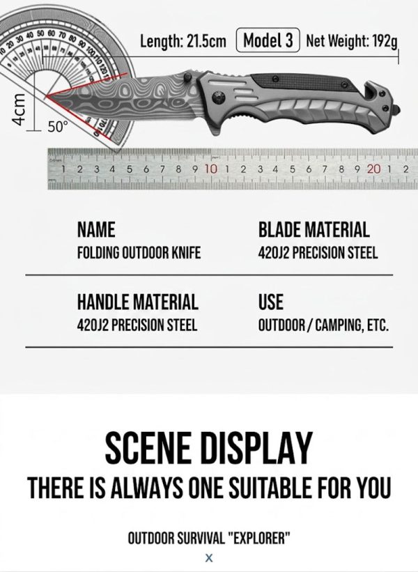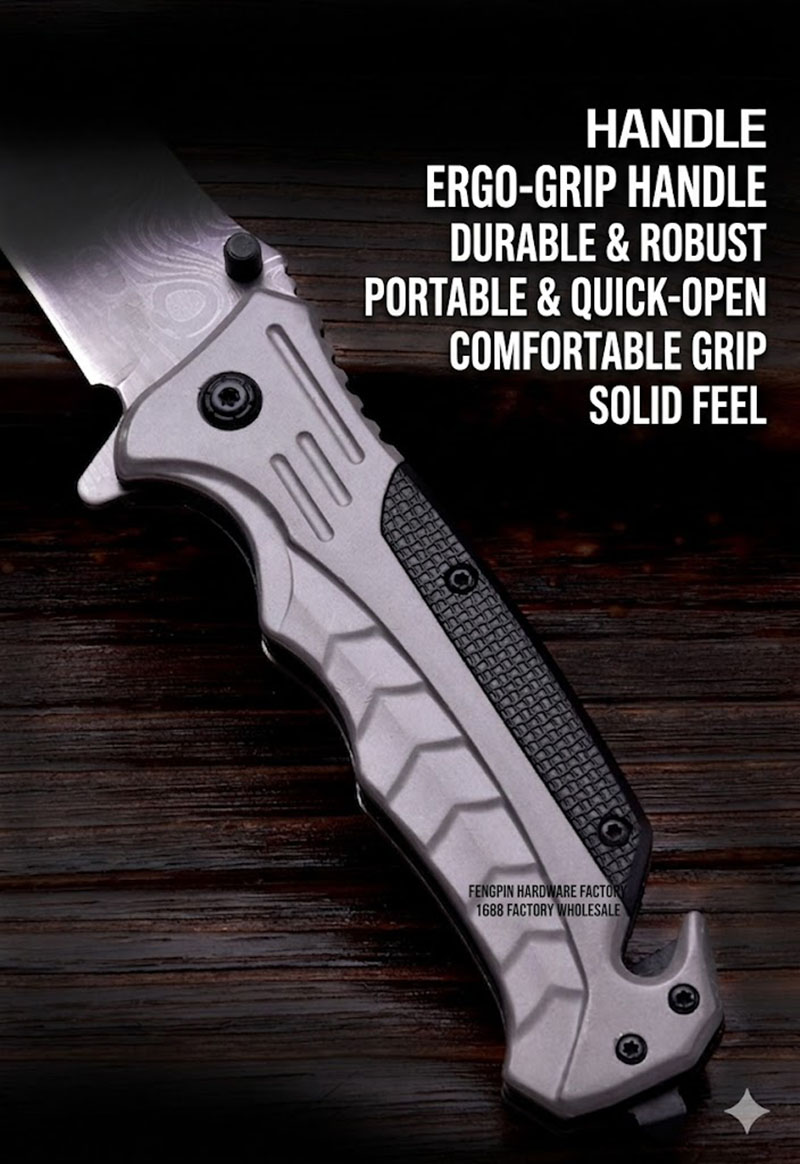 Ergonomic and Tactical Design Power means nothing without control. The handle is meticulously crafted to provide a highly secure and comfortable grip, reducing hand fatigue during extended use. Its textured surface guarantees anti-slip performance, allowing you to maintain perfect handling and safety even when operating the knife in demanding or high-pressure situations. The smooth folding mechanism allows for quick, reliable deployment exactly when you need it.