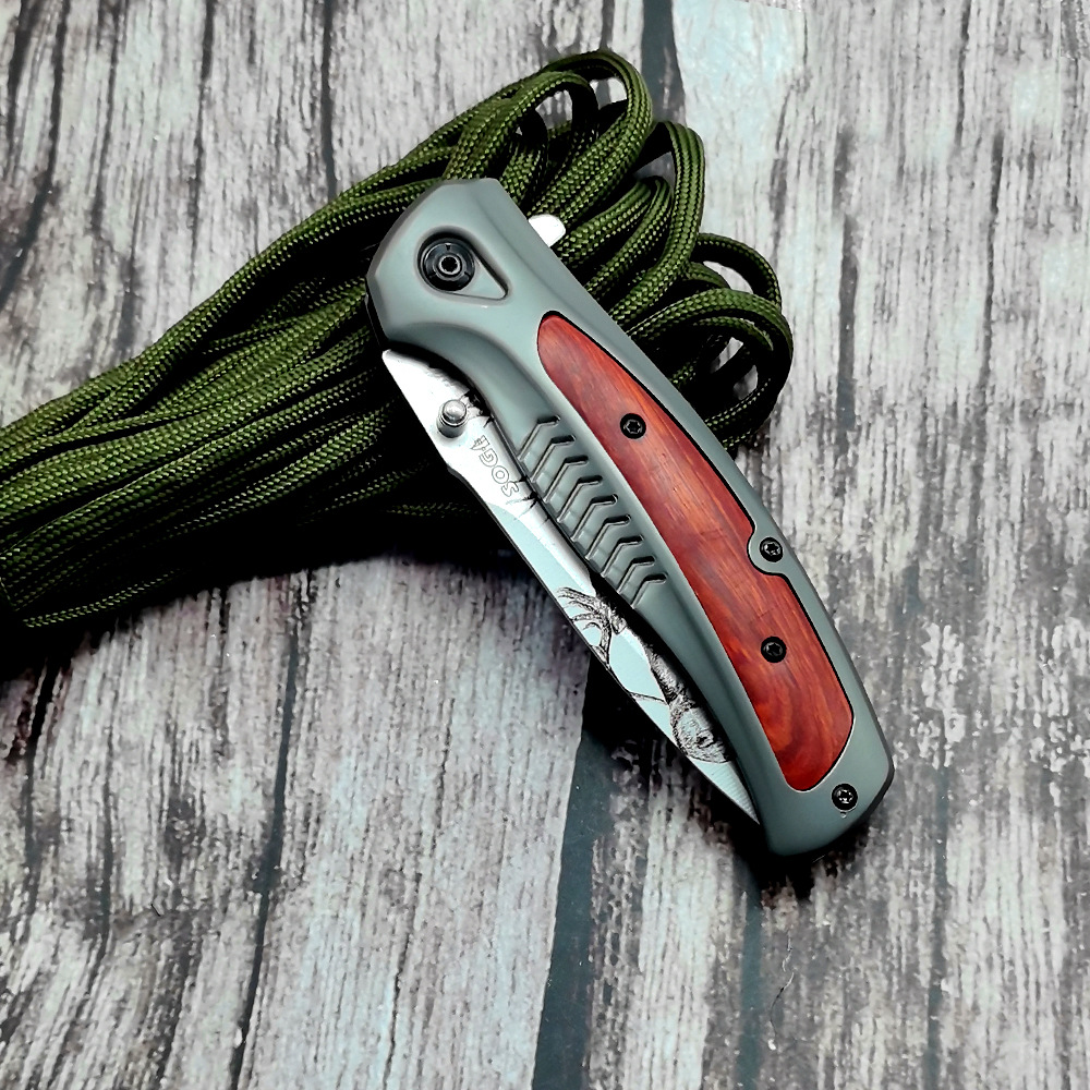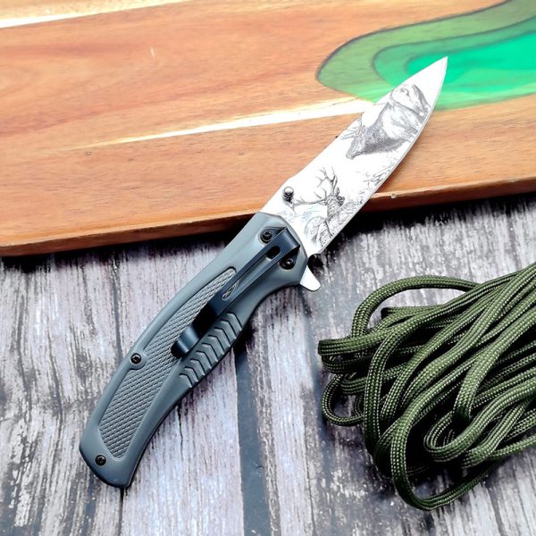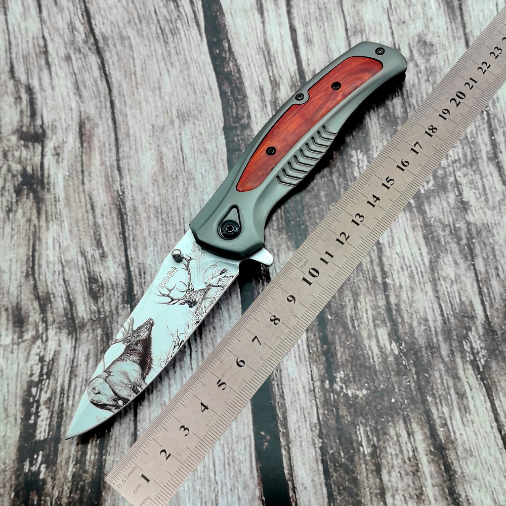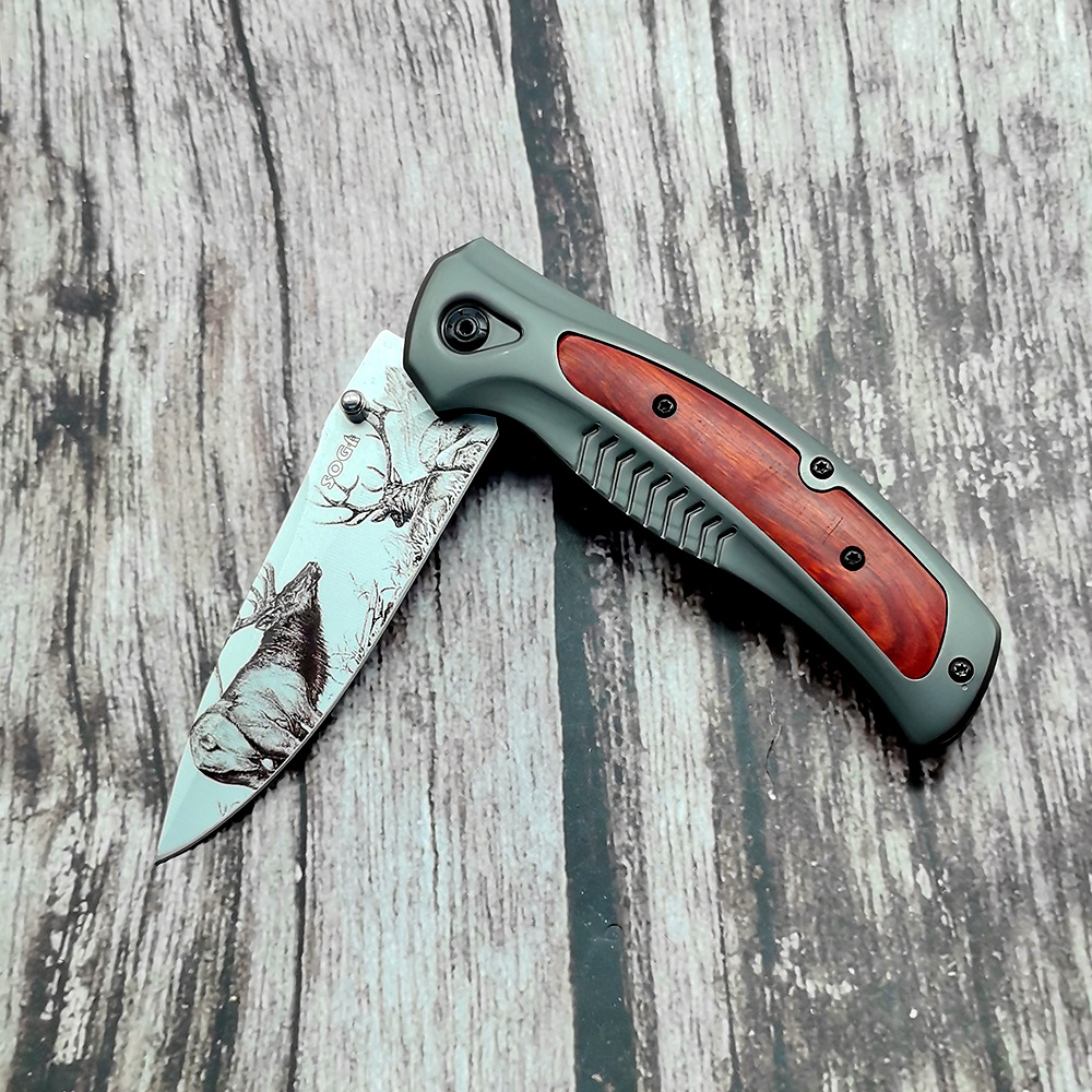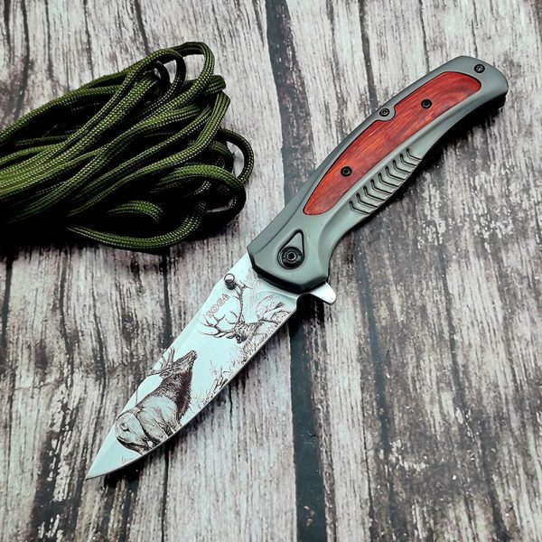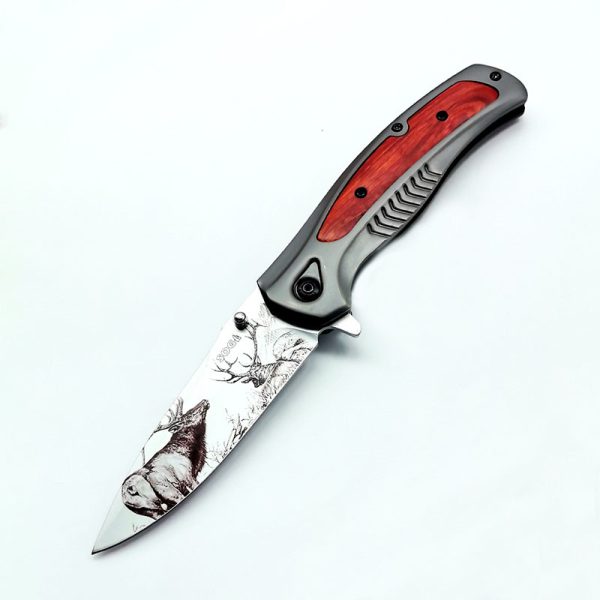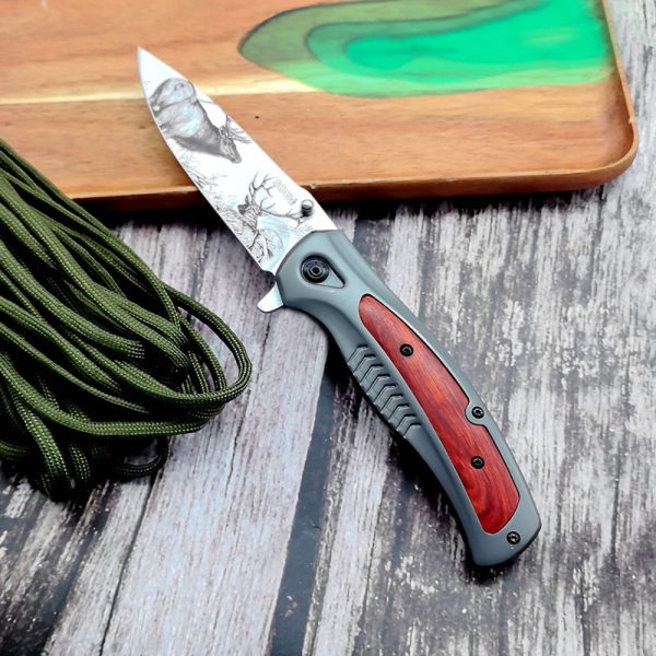 Exquisite Design Meets Rugged Utility New Way Smile Shop understands that your outdoor gear should be as unique as your adventures. The DA337 model stands out with an exquisite, creative 3D printed wildlife design featuring a majestic deer on the blade. This is not just a tool; it is a piece of functional art. The handle is meticulously crafted from tough carbon steel paired with elegant rosewood accents, providing a sophisticated look and a comfortable, secure grip.