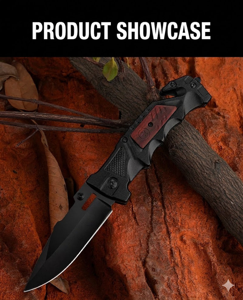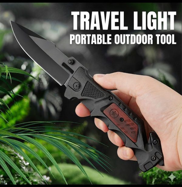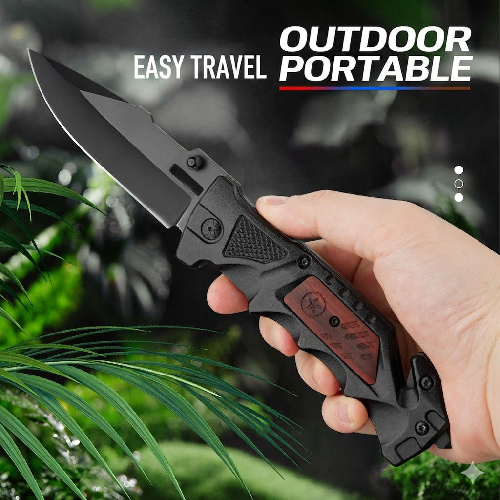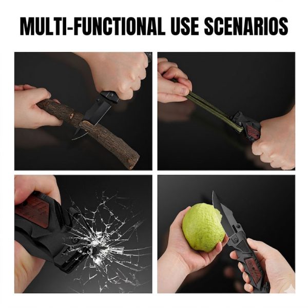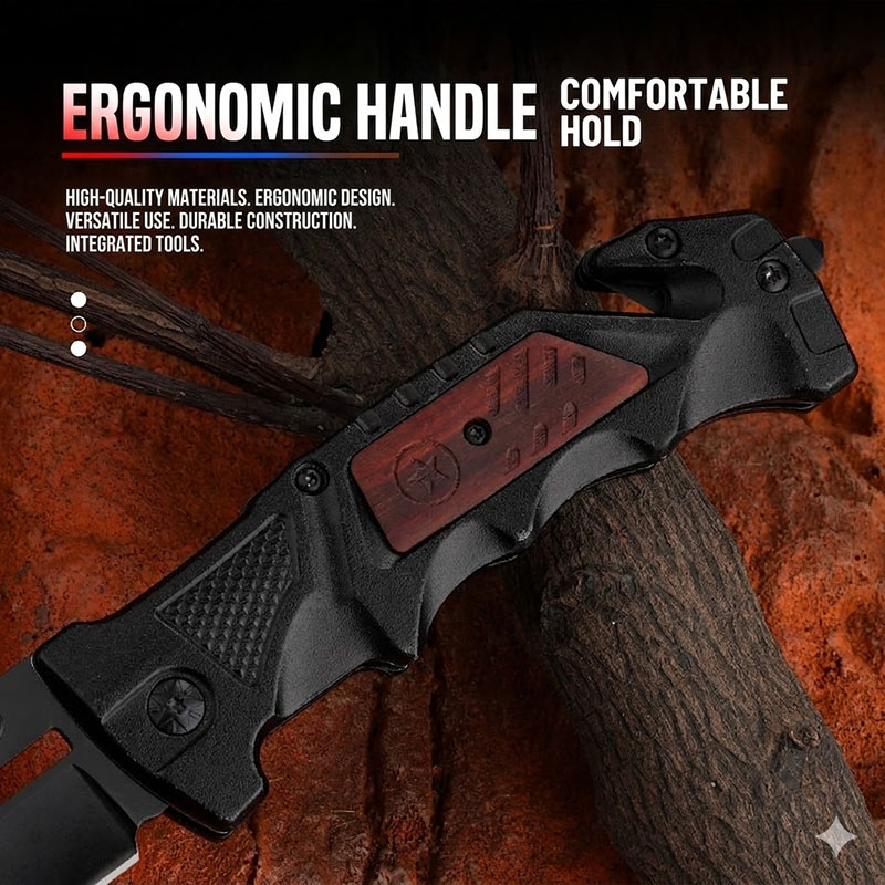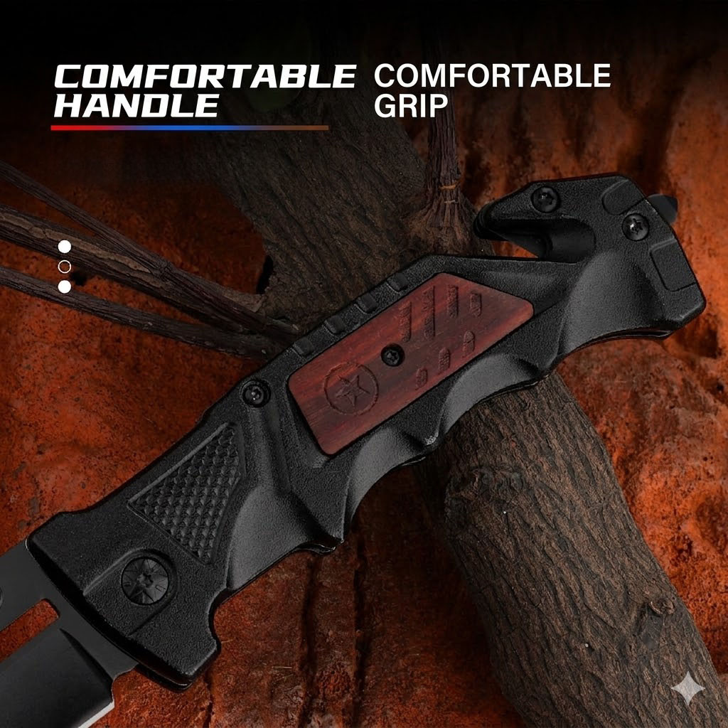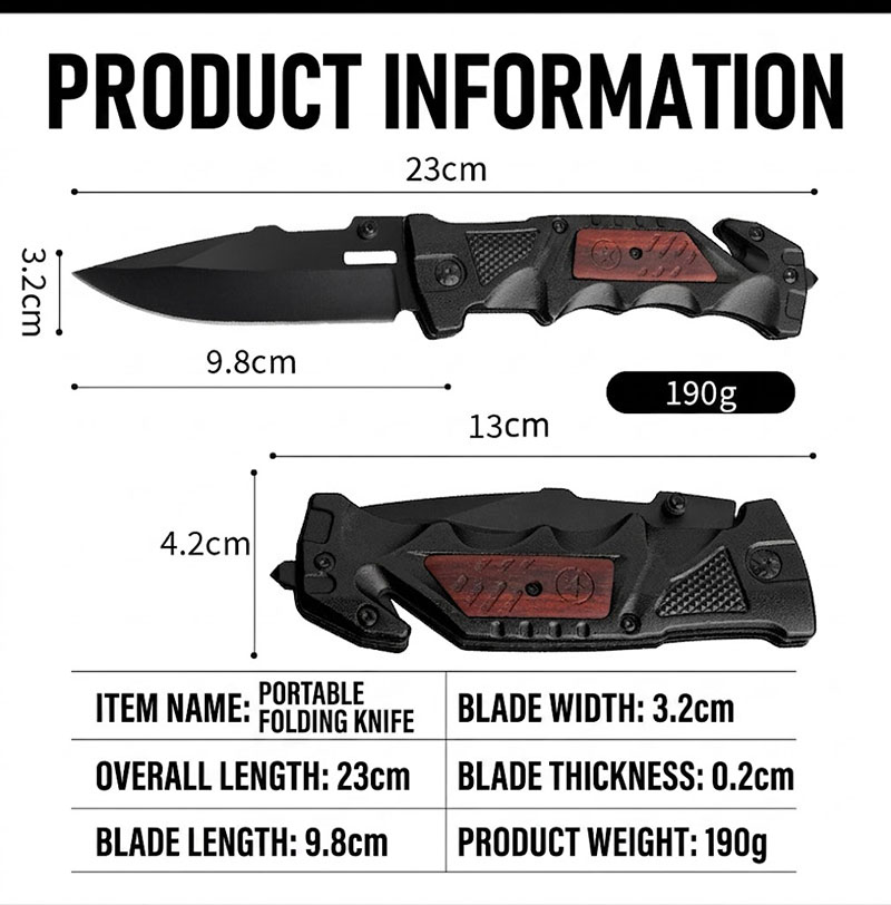 Ultimate Multi-Functional Survival Tool This is more than just a portable knife; it is a vital survival instrument. The base of the handle ingeniously integrates a dedicated cord and seatbelt cutter, alongside a hardened glass breaker tip for emergency rescue situations. Despite its impressive 23cm open length, the knife folds down to a compact 13cm and weighs only 190g, making it incredibly easy to travel light. Complete with a heavy-duty pocket clip, it securely attaches to your belt or tactical backpack, ready for immediate deployment whenever you need it.