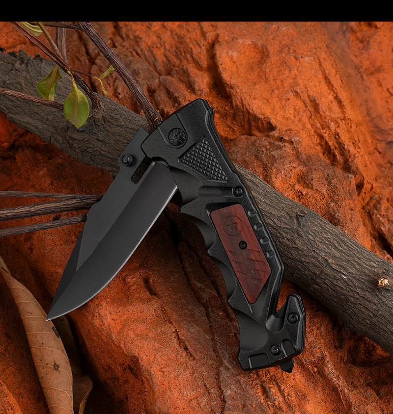 Rugged Tactical Design At New Way Smile Shop, we always hope to bring you gear that effortlessly balances rugged tactical performance with refined aesthetics. The K39 folding knife is built for those who demand reliability in the wild. The handle features an ergonomic, anti-slip design enhanced by a classic wooden inlay with a distinctive star emblem, providing both a highly comfortable grip and a striking visual appeal. Crafted to sit securely in your hand, it ensures maximum control during heavy-duty cutting tasks.