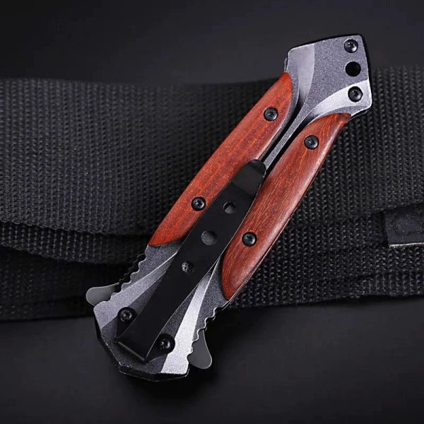Exquisite Craftsmanship with Red Sandalwood The K92 Tactical Folding Knife (Model DA27) stands out as a masterpiece of functional art. At New Way Smile Shop, we believe that a high-performance tool should also possess timeless beauty. The handle is meticulously crafted from premium Red Sandalwood combined with polished steel, providing not only a sophisticated look but also a warm, comfortable, and natural grip that improves with age. Whether you are using it in the field or displaying it in a collection, the K92 exudes quality.