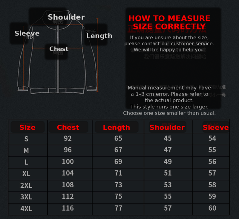 - Size chart included in the product materials