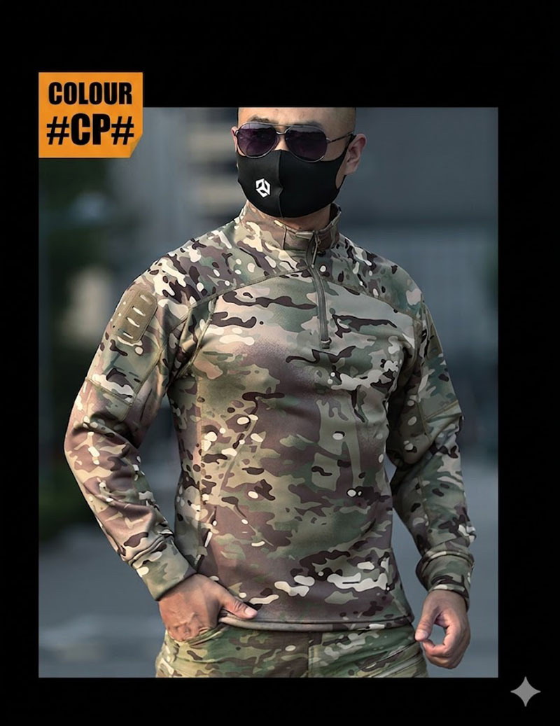 A streamlined tactical long-sleeve top designed for comfort, warmth, and mobility in cooler conditions. With its clean quarter-zip front, camouflage options, and body-hugging athletic fit, this piece works well for training, travel, layering, and everyday outdoor wear in Cambodia’s cooler mornings, rainy days, and mountain trips.