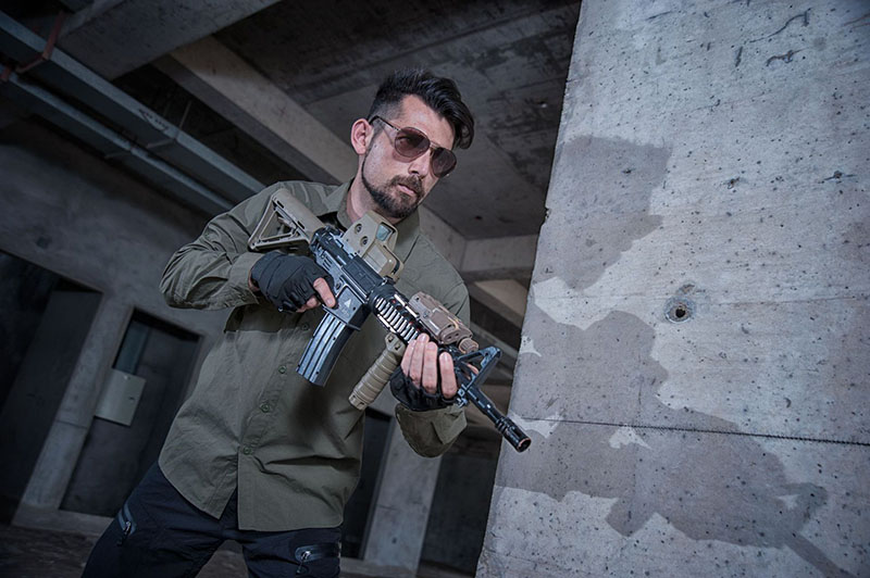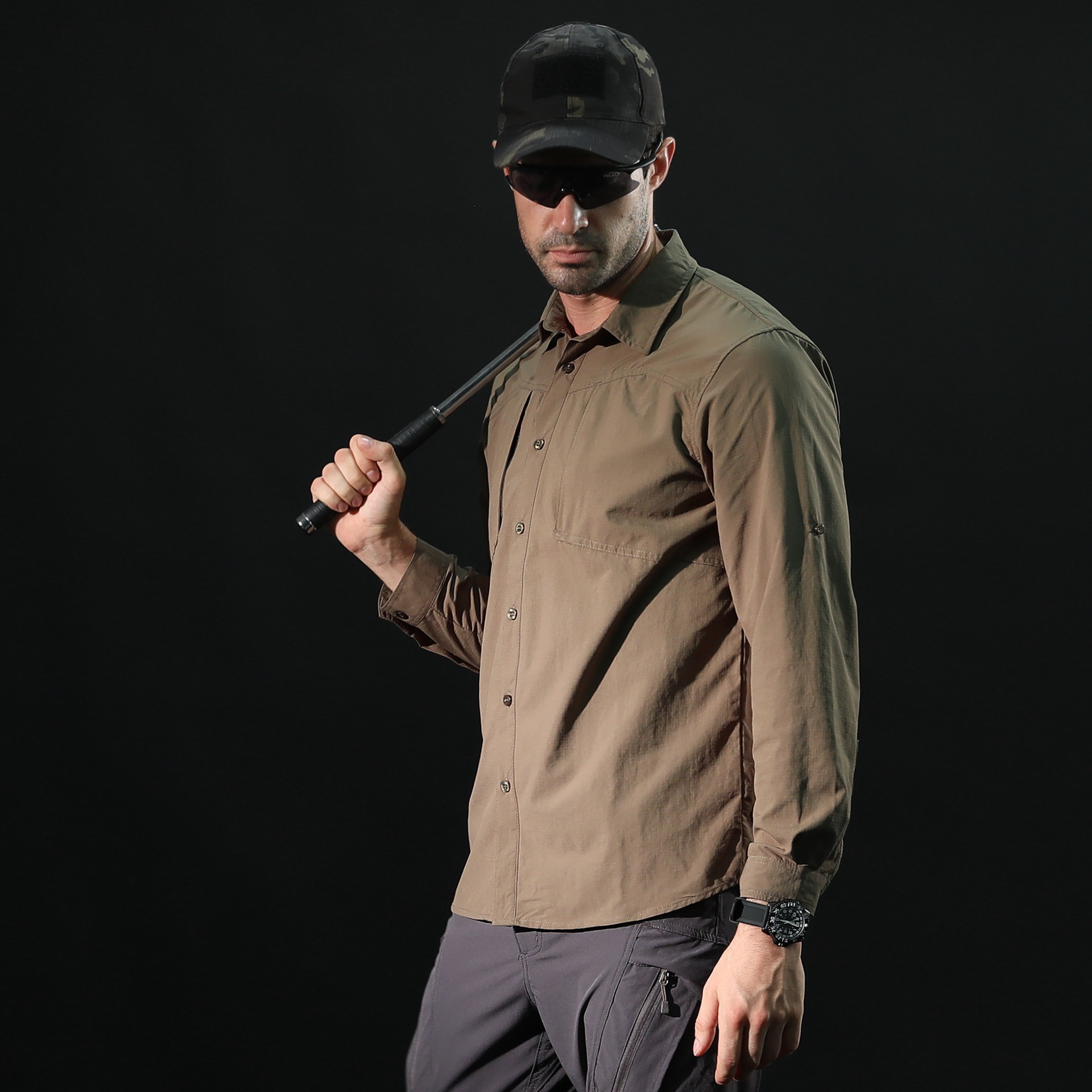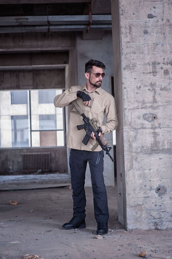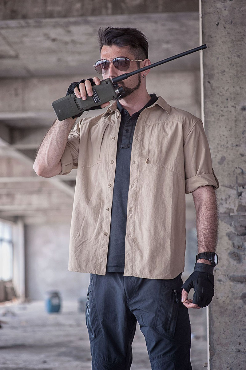 - Long-sleeve tactical shirt with clean button-up front