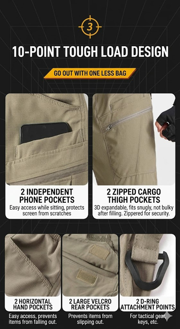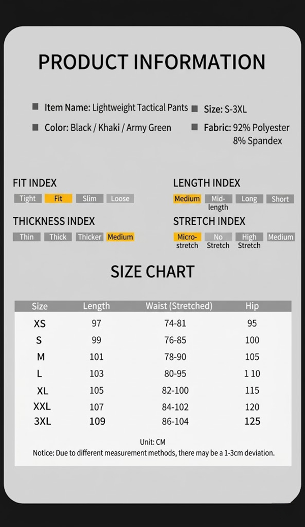 Lightweight Everyday Performance Without Extra Bulk These pants are a strong option for customers who want the look of tactical wear without the weight of heavy-duty field trousers. The lighter fabric feel helps IX06 stay more wearable for long hours, warm days, and frequent movement, while still delivering the outdoor utility character that many customers appreciate. This balance makes them especially useful for customers who want practical function in a cleaner and more approachable format.