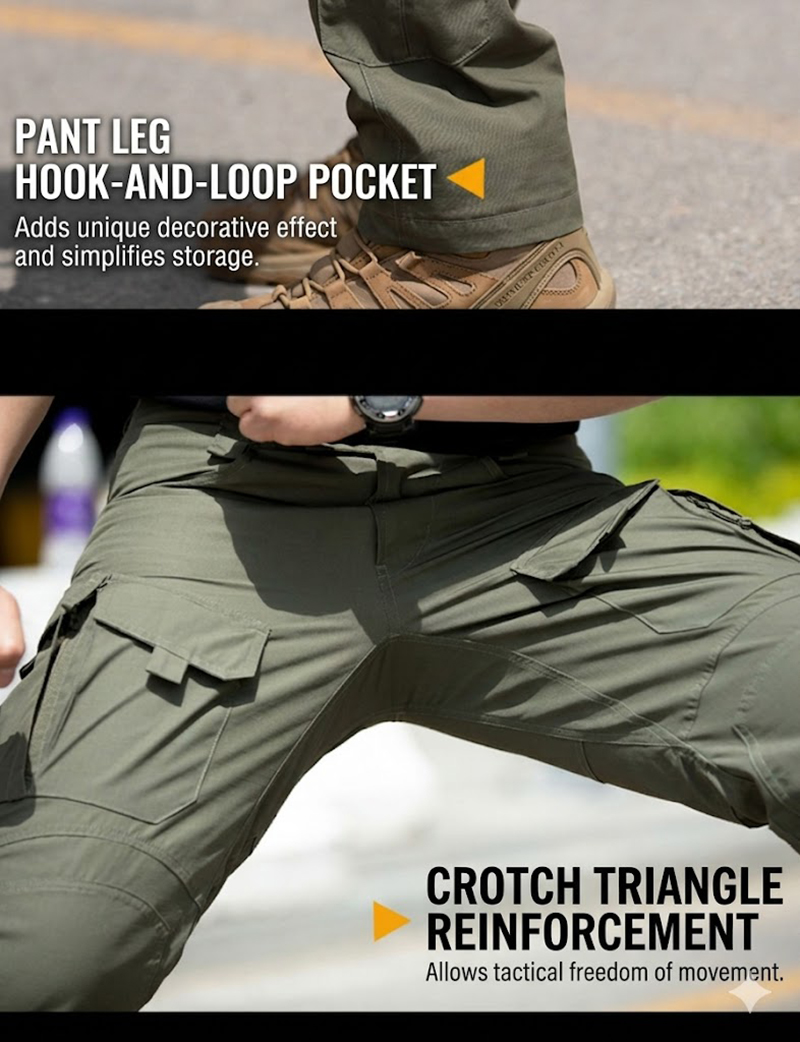 Reinforced Construction for More Dependable Wear IX19 also includes reinforced construction details that add confidence for regular movement and repeated use. The reinforced crotch triangle supports durability in an important high-motion area, while the hook-and-loop pocket detail adds a practical and more tactical finish. These small structural features help the pants feel more capable and more dependable for everyday wear, training, travel, and outdoor activity.