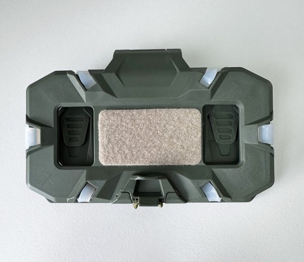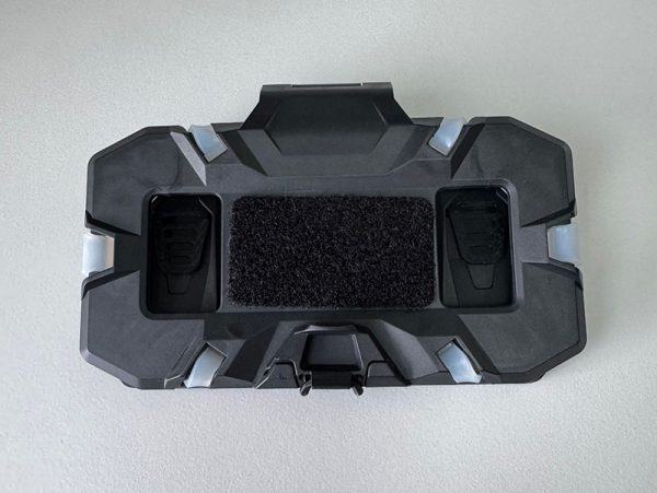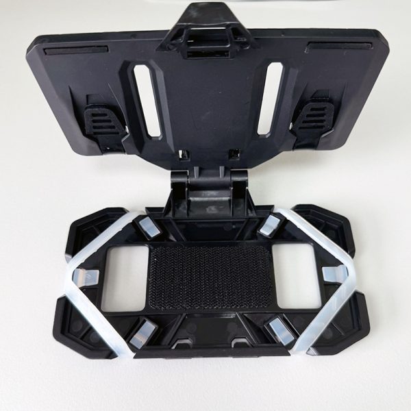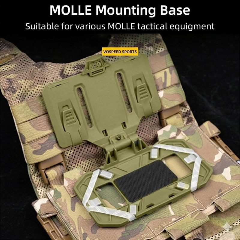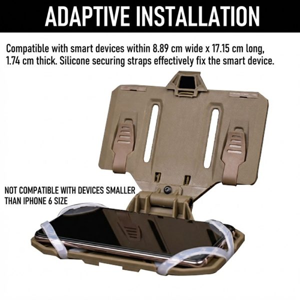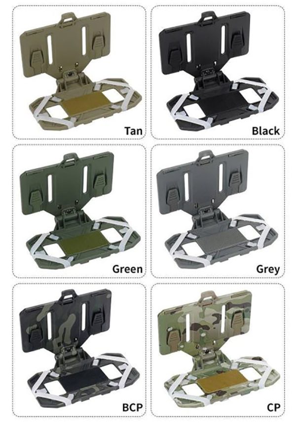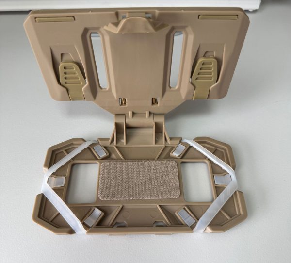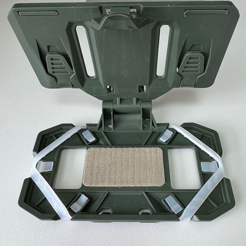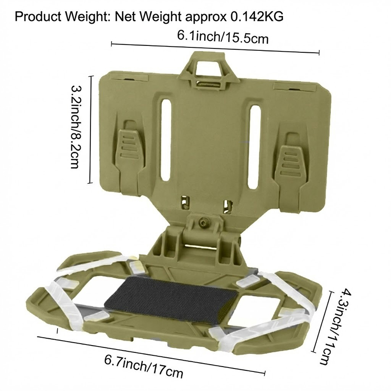 The rear section includes a flat mounting base with a hook-and-loop area and a MOLLE-style attachment layout, while the front section folds open to support the device. This structure suggests fast setup, compact storage when not in use, and practical use in movement-heavy environments where hands-free access matters.