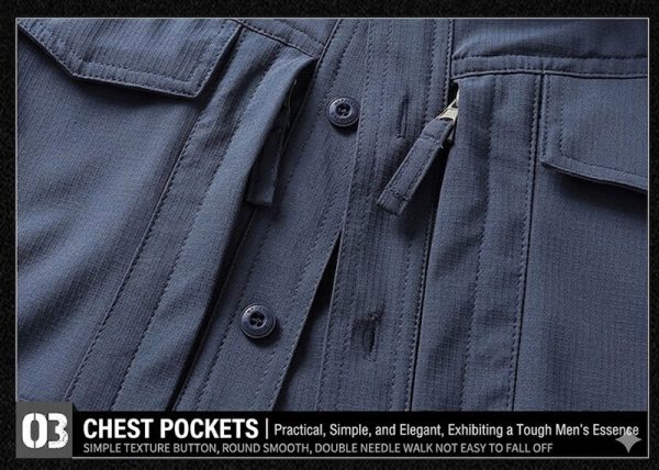 Practical Multi-Pocket Front The chest area includes multiple flap and zip-style storage details that give the shirt both function and character. These pockets add utility for carrying small essentials while also reinforcing the tactical workwear look of the design.