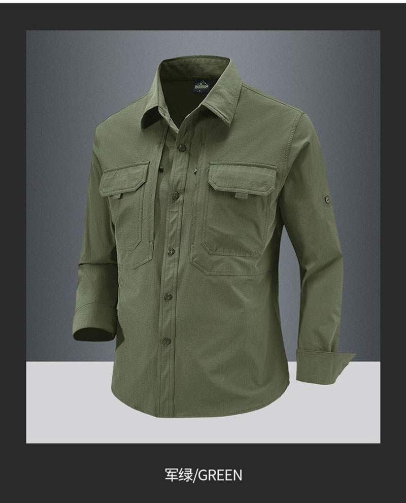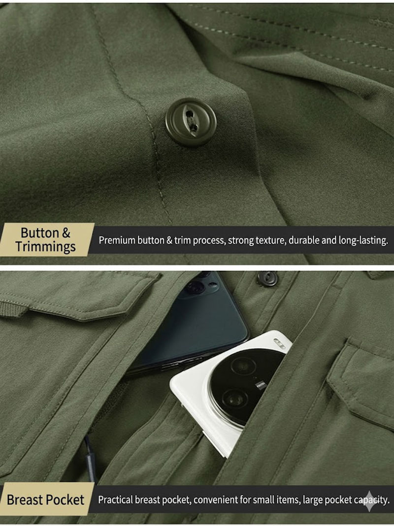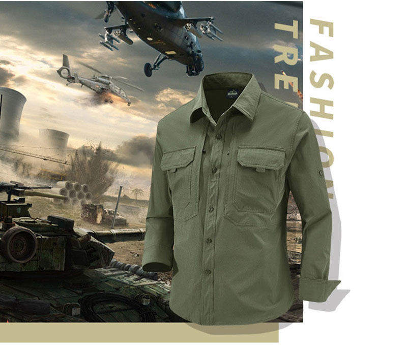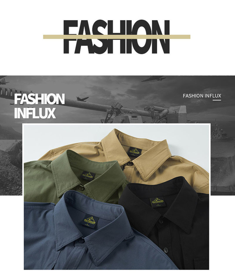 This shirt carries a clean military-inspired profile with a pointed collar, straight placket, and neatly placed chest pockets. The silhouette feels sharp enough for casual business settings while still fitting naturally into outdoor and off-road styling.