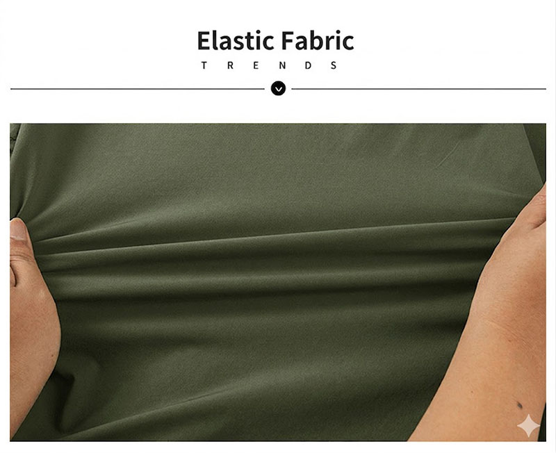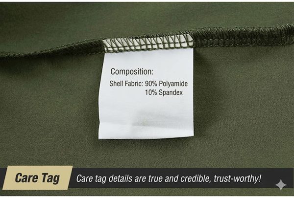 The fabric presentation highlights a soft, smooth surface and flexible hand feel. The care tag visible in the product details lists the shell composition as 90% polyamide and 10% spandex, supporting lightweight wear, easy movement, and quick-drying everyday performance.