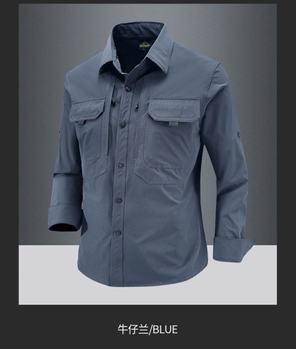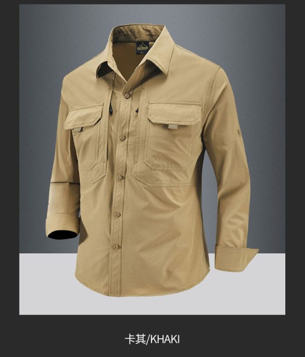The SHL17 Tactical Quick-Dry Long Sleeve Shirt blends outdoor function with a polished casual look. Designed with dual flap chest pockets, a structured collar, adjustable cuffs, and a clean front placket, it offers a smart balance of utility and comfort for commuting, travel, outdoor work, and weekend wear. The fabric tag indicates a 90% polyamide and 10% spandex blend, giving the shirt a smooth feel with flexible movement.