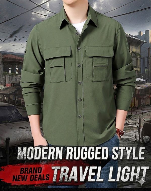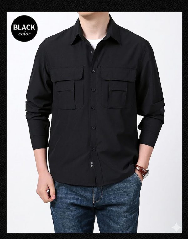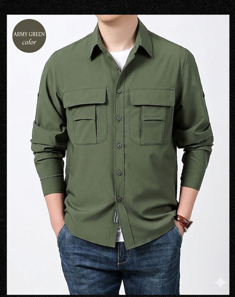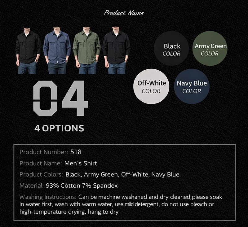 The product is presented in multiple easy-to-style colors including Black, Army Green, Off-White, and Navy Blue. These options make the shirt suitable for pairing with jeans, cargo pants, workwear trousers, or casual outdoor layers. It can work as a lightweight overshirt, a smart daily button-up, or a versatile travel shirt depending on the outfit.