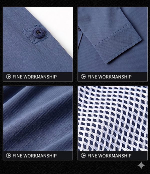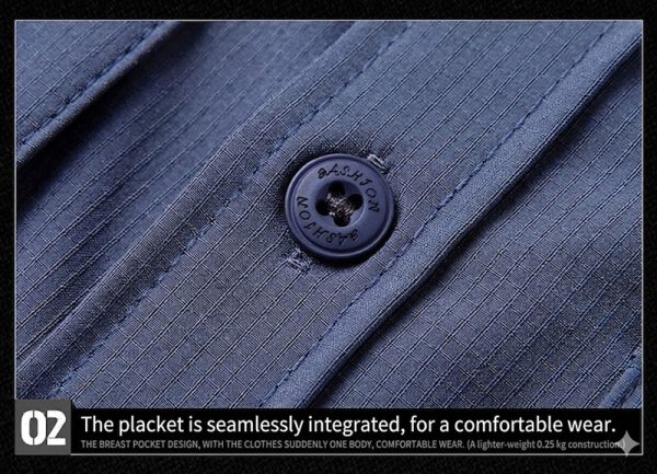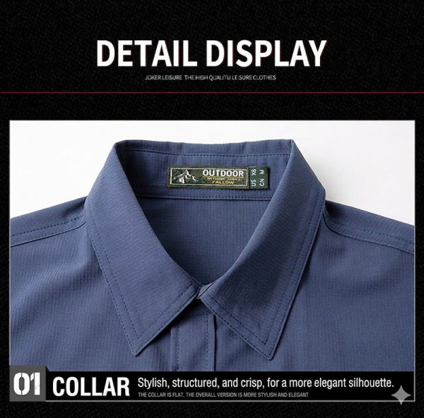 The product graphics highlight a technical fabric story with stretch, quick-dry performance, and a wrinkle-resistant presentation. The fabric surface appears smooth and lightweight, which supports comfortable movement and makes the shirt feel suitable for spring, summer, and changing daily conditions.