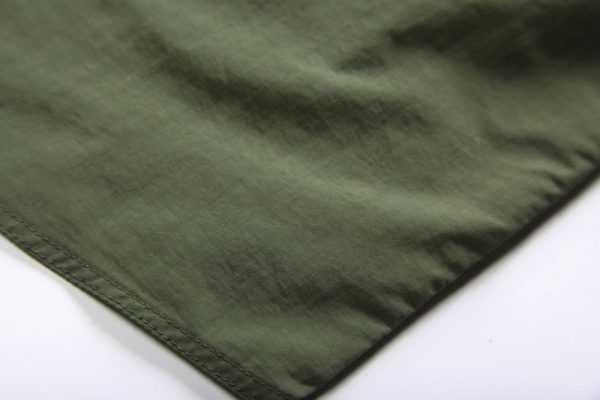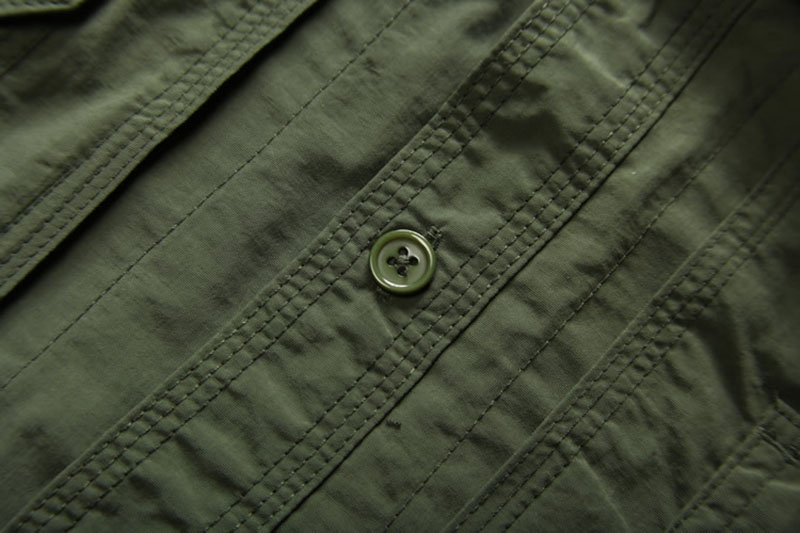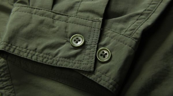 Close-up views show the collar, buttons, cuff finish, stitching, and hem. The collar is structured and crisp, the buttons look simple and durable, and the cuff design appears clean and easy to wear. The hem and seam finishing contribute to a tidy overall presentation that works well for both casual and outdoor-oriented outfits.