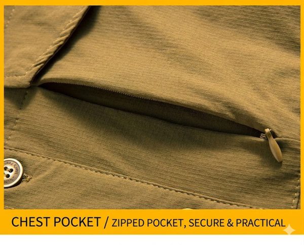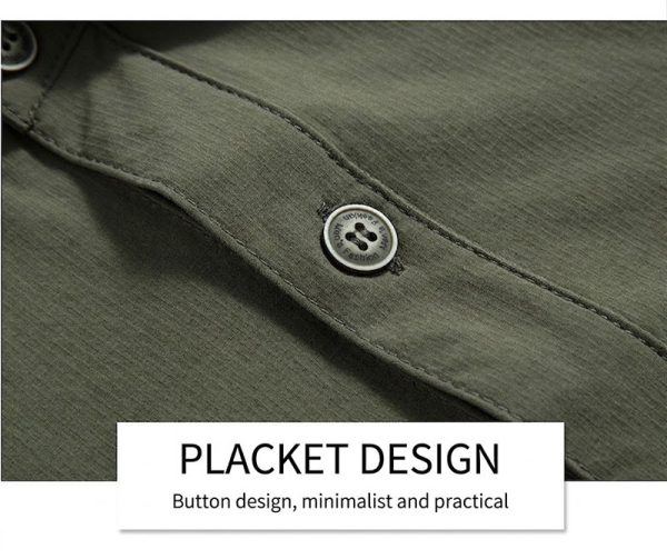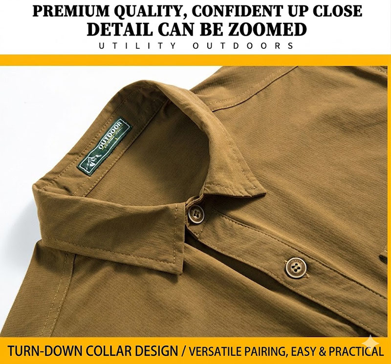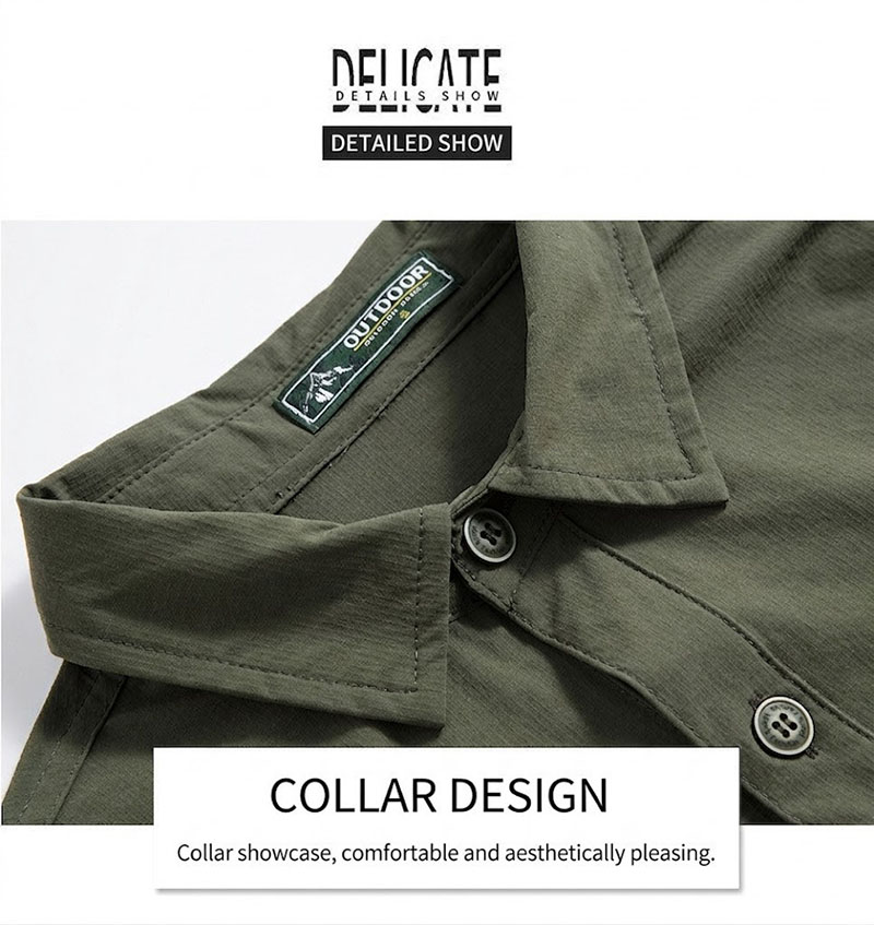 The promotional graphics emphasize a quick-drying, durable, and washable fabric concept. That gives the shirt a practical travel and outdoor identity, especially for customers who want something easy to care for and comfortable to wear across different daily situations.