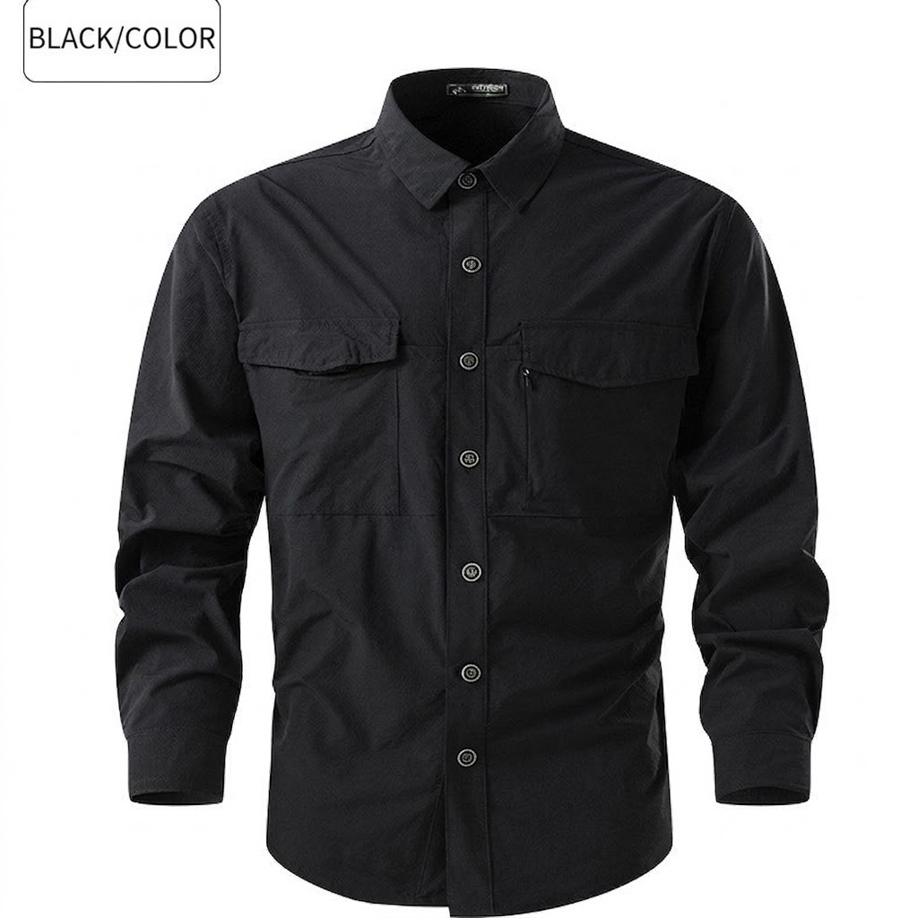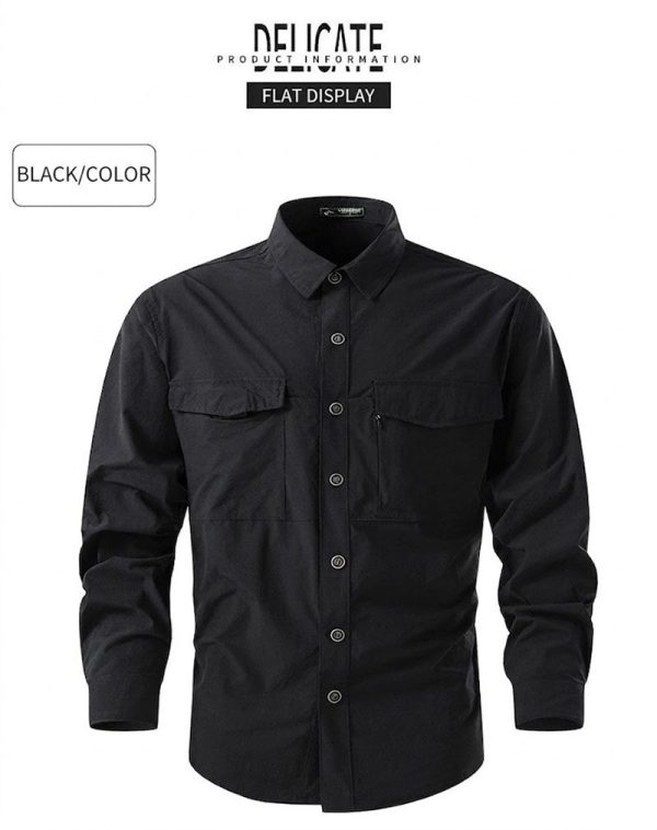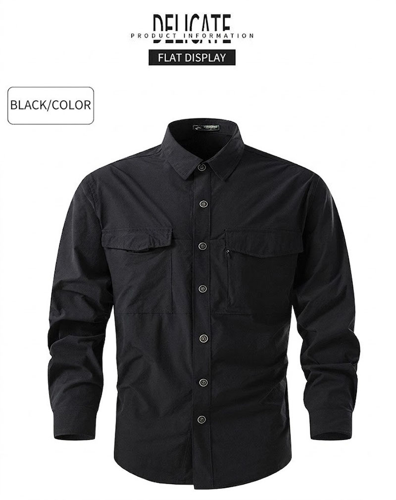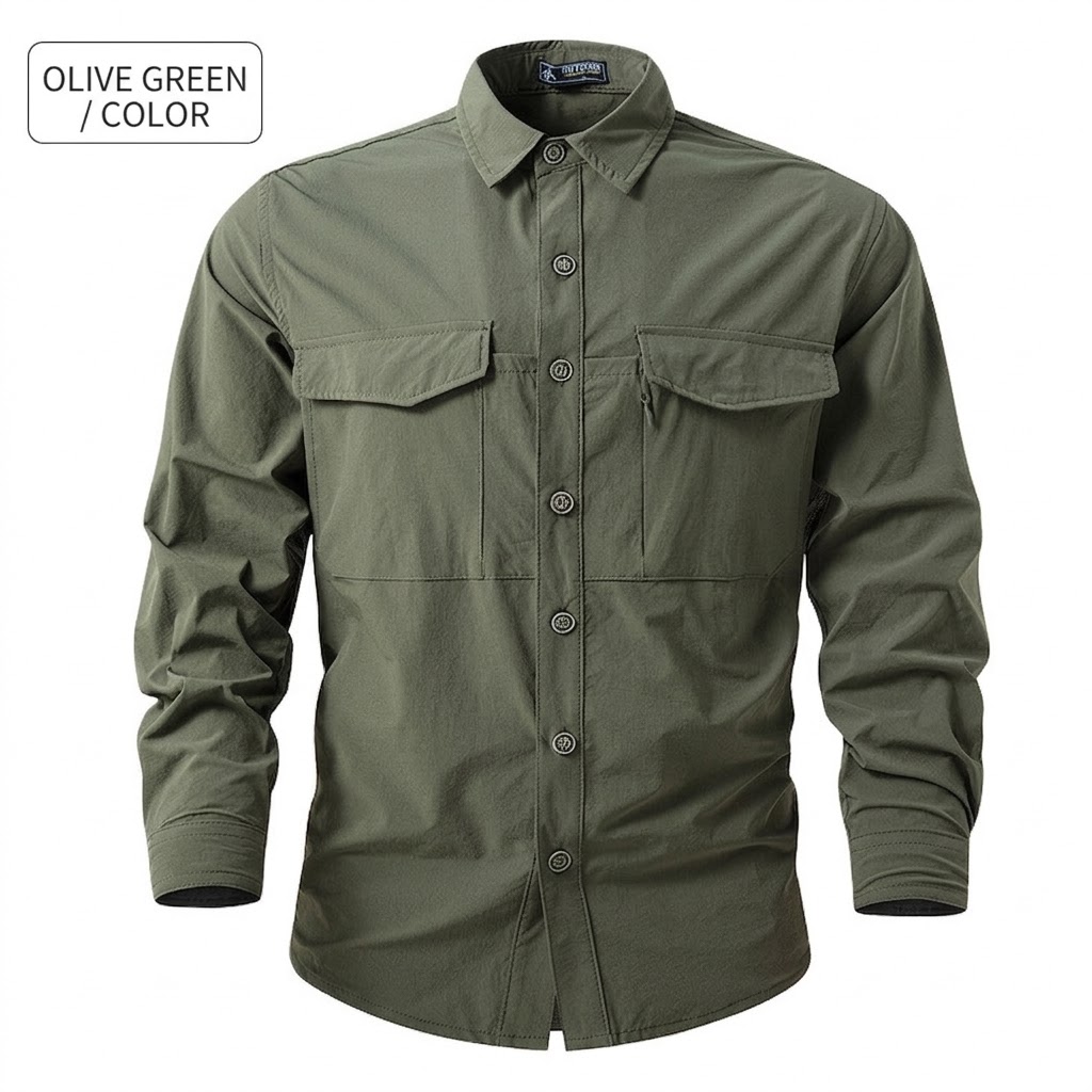 SHL24 is a lightweight long-sleeve utility shirt designed for outdoor movement, travel, hiking, and daily wear. The product presentation highlights quick-dry nylon-blend fabric, light stretch, dual chest pockets, a clean turn-down collar, and a structured fit that balances tactical utility with an easy everyday look.