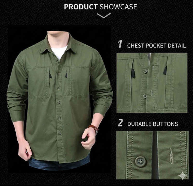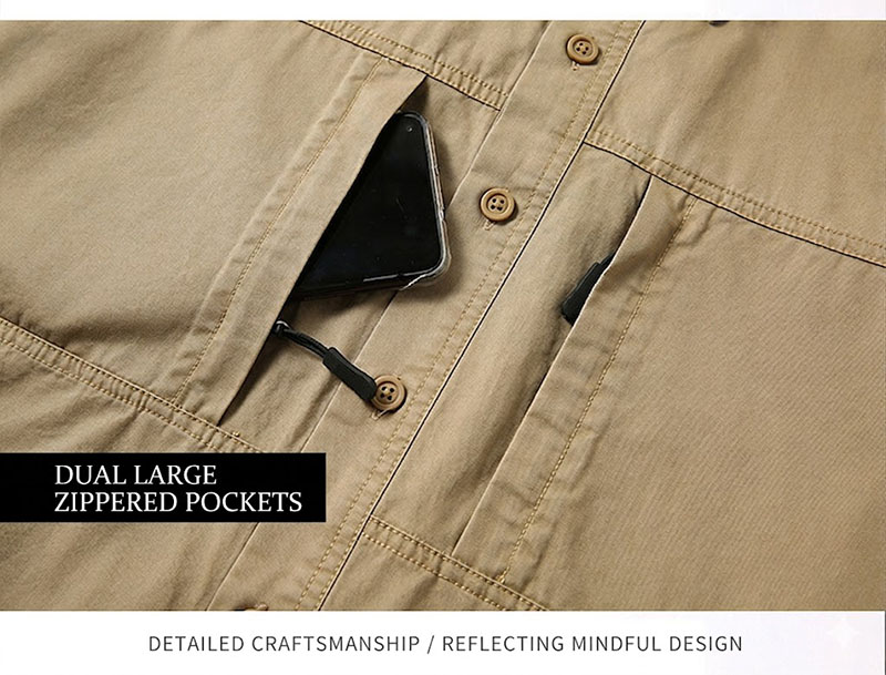 A standout detail is the dual chest-pocket layout, which adds both visual structure and functional storage. One close-up panel highlights large zippered chest pockets, giving the shirt more utility than a standard casual button-up. This feature helps the design feel more rugged and suitable for light travel, casual outdoor use, and day-to-day carry of small essentials.