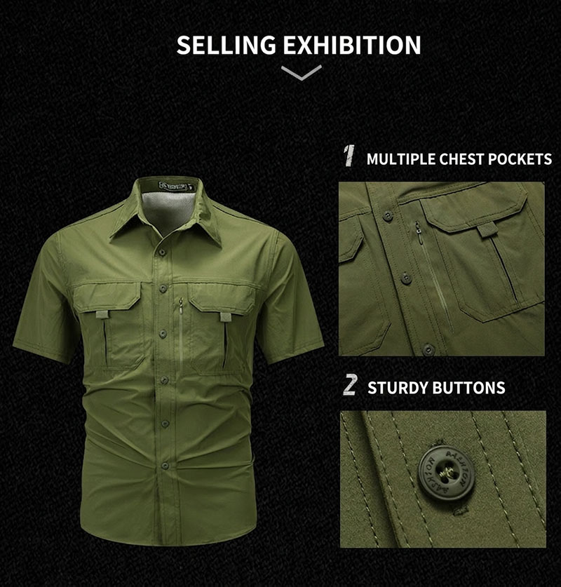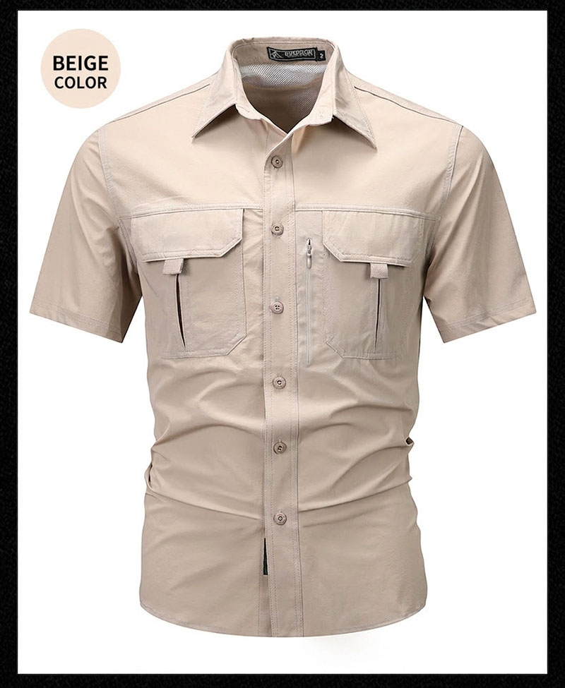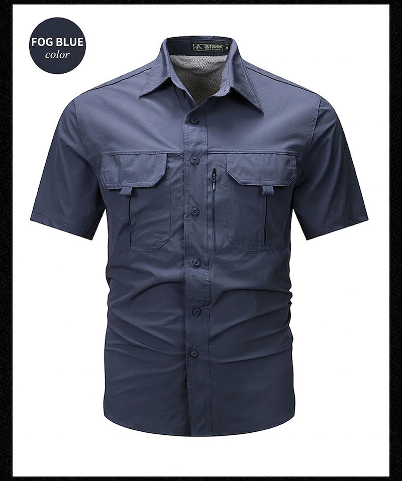 SHS05 is a lightweight summer outdoor short-sleeve utility shirt designed for breathable comfort, quick-drying performance, and relaxed daily practicality. With its multi-pocket workwear styling, thin fabric feel, light stretch comfort, and easy casual look, it is well suited for travel, commuting, hiking, fishing, camping, and everyday warm-weather wear.