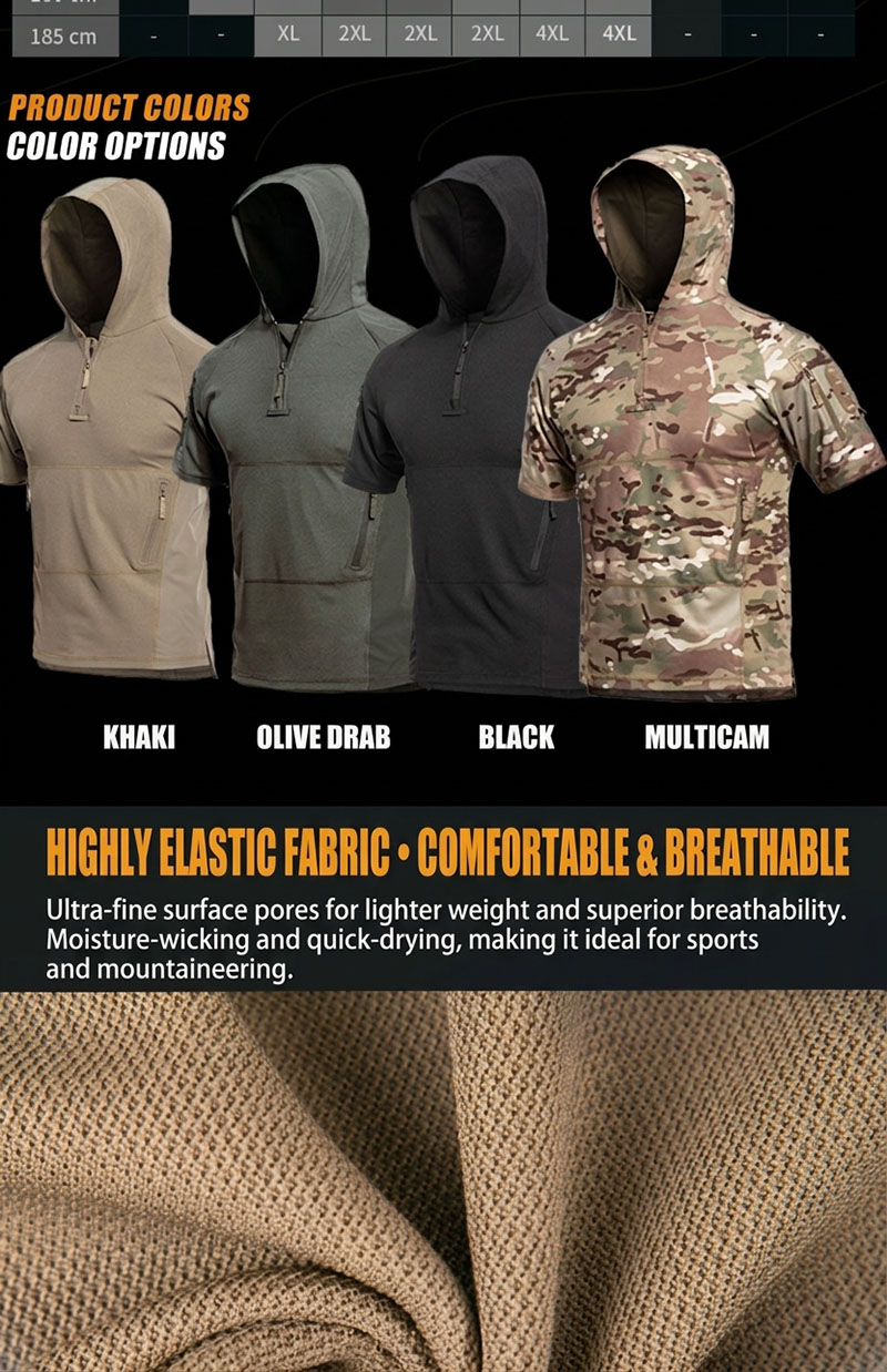 The hooded design gives the shirt a stronger outdoor-athletic identity compared with a standard short-sleeved tee. This detail adds visual interest and supports a more relaxed performance-inspired style that works well with joggers, shorts, cargo pants, and casual outdoor outfits.