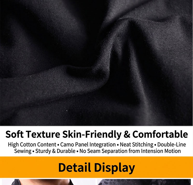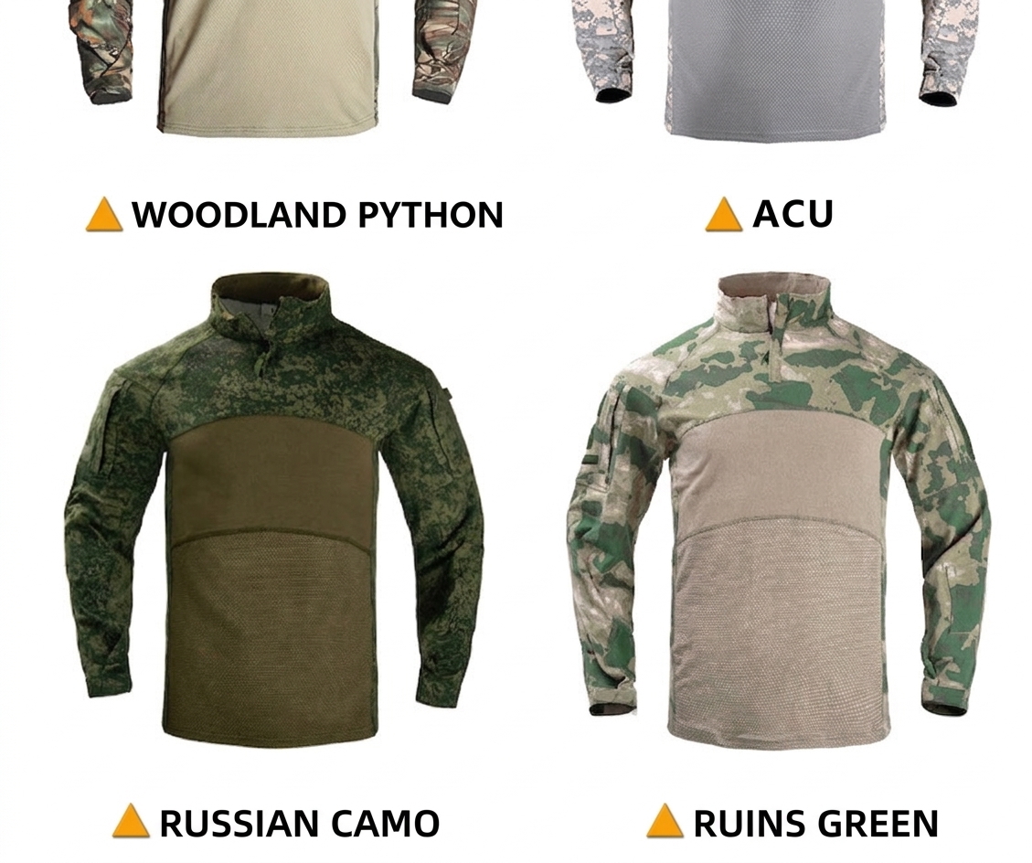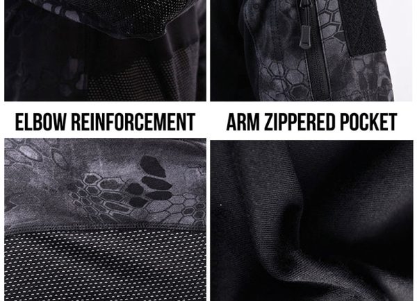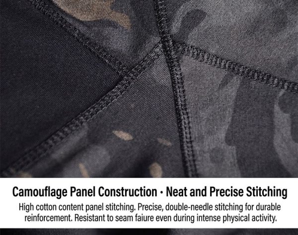 - Solid stretch body panel paired with camo or tactical-color sleeves