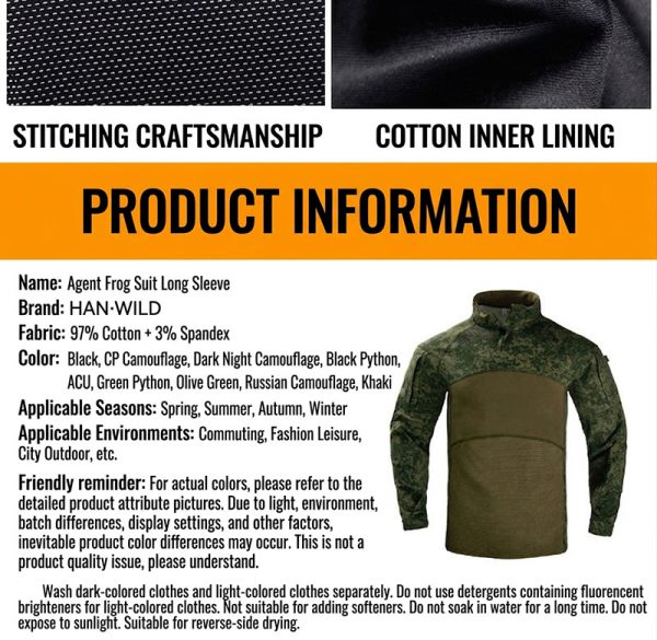 The uploaded file identifies the product as a long-sleeve tactical frog suit training top without protective inserts and shows several colorways. This supports a straightforward product positioning: a tactical training shirt built for flexibility, comfort, and visual compatibility with outdoor and combat-style gear.
