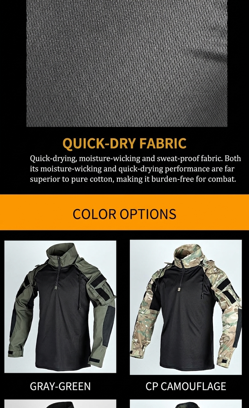 TSL05 is a tactical frog suit style long sleeve shirt designed for active outdoor wear, training, airsoft, and utility-focused everyday use. It combines a quick-dry main body with more durable tactical sleeves, multi-pocket arm storage, hook-and-loop panels, and a detachable hood option for a flexible field-ready look.