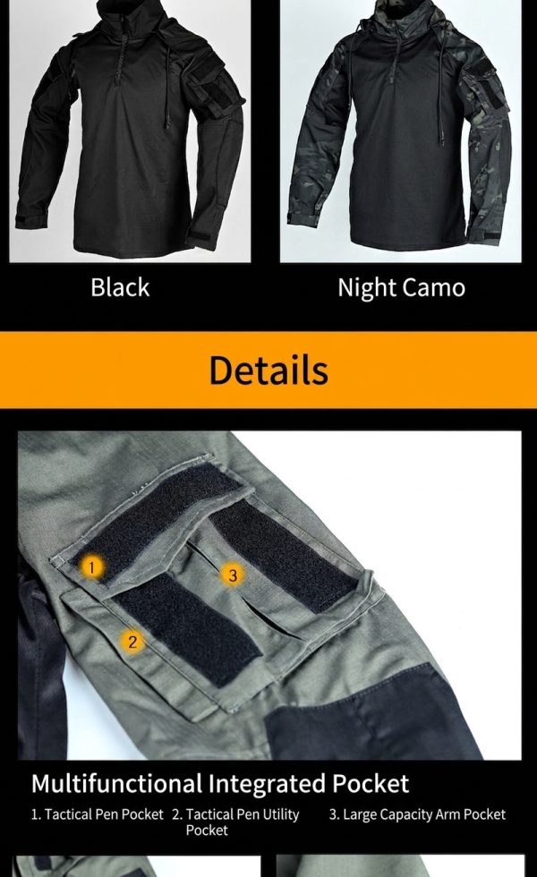 The sleeves feature large integrated arm pockets and hook-and-loop panel areas, giving the shirt a more functional tactical identity. These details are useful for storing compact accessories or attaching patches, while also reinforcing the visual character expected from a combat-style shirt.