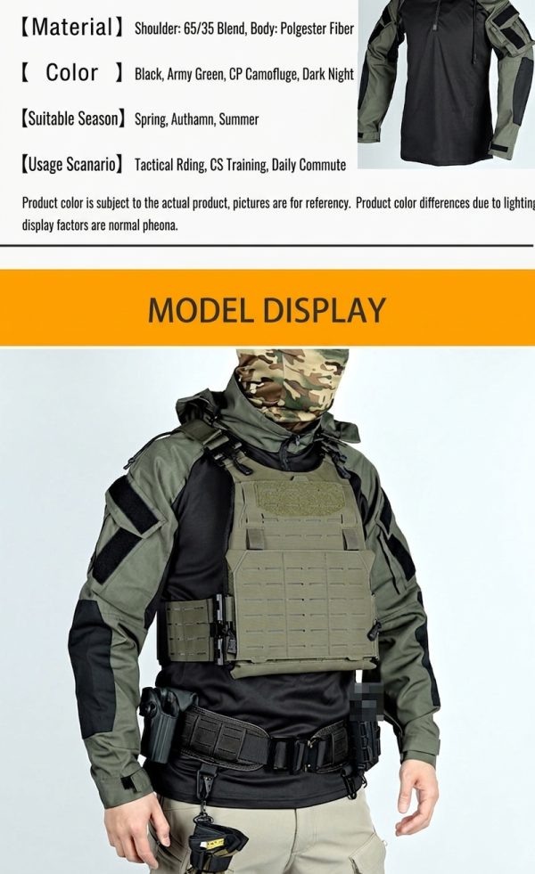 The image set presents several color combinations, including black, grey, grey-green, and camouflage sleeve variants. Some images also show the top paired with plate carriers, which supports its positioning as a practical base layer for tactical training, airsoft, range wear, and outdoor setups.