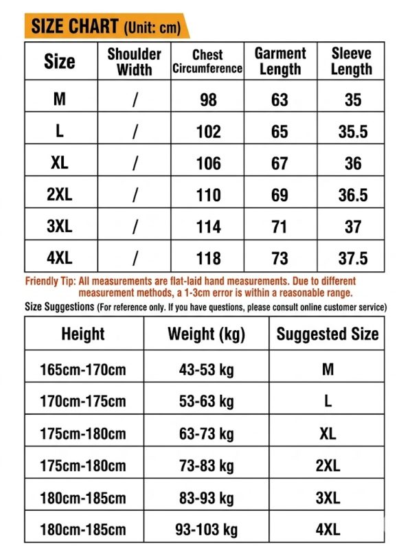 Size range shown in the product chart The included size chart shows sizes from M to 4XL, with suggested height and weight guidance provided in the visual. This gives buyers a broader size selection and helps position the TSS21 as a practical option for different body types.