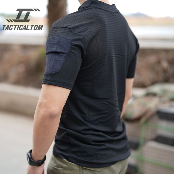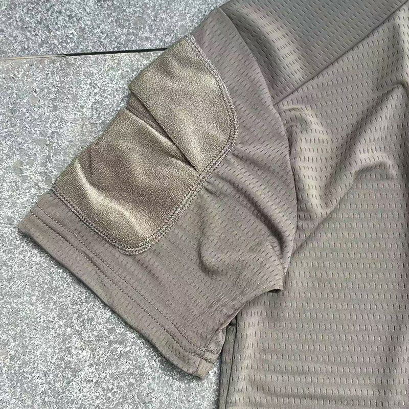 Shoulder Panel Construction A standout design feature is the contrasting reinforced shoulder panel section. The shoulder area appears more structured and slightly different in texture, adding both visual depth and a tactical character to the shirt. This detail helps the product stand out from standard sports T-shirts while keeping the overall design minimal and wearable.